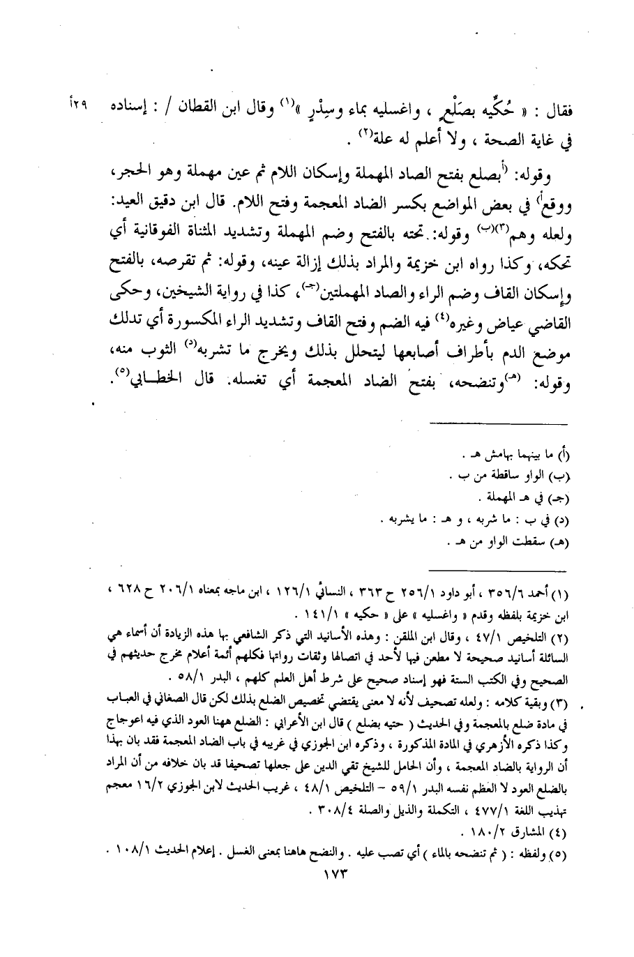 (¬3) وبقية كلامه: ولعله تصحيف لأنه لا معنى يقتضي تخصيص الضلع بذلك لكن قال الصغاني في العباب في مادة ضلع بالمعجمة وفي الحديث (حتيه بضلع) قال ابن الأعرابي: الضلع ها هنا العود الذي فيه اعوجاج وكذا ذكره الأزهري في المادة المذكورة، وذكره ابن الجوزي في غرببه في باب الضاد المعجمة فقد بأن بهذا أن الرواية بالضاد المعجمة، وأن الحامل للشيخ تقي الدين على جعلها تصحيفا قد بأن خلافه من أن المراد بالضلع العود لا العظم نفسه البدر 1/ 59 - التلخيص 1/ 48، غريب الحديث لابن الجوزي 2/ 16 معجم تهذيب اللغة 1/ 477، التكملة والذيل والصلة 4/ 308.