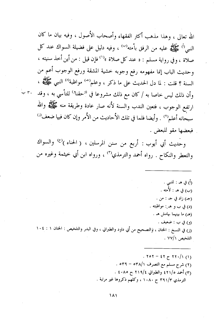 الله تعالى، وهذا مذهب أكثر الفقهاء وأصحاب الأصول، وفيه بيان ما كان النبي (أ) - صلى الله عليه وسلم - عليه من الرفق بأمته (ب)، وفيه دليل على فضيلة السواك عند كل صلاة، وفي رواية مسلم: "عند كل صلاة" (¬1) فإن قيل: من أين أخذ سنيته، وحديث الباب إنما مفهومه رفع وجوبه خشية المشقة ورفع الوجوب أعم من السنة؟ قلت: لما دل الحديث على ما ذكر، وعلم (جـ) مواظبة (د) النبي - صلى الله عليه وسلم -، وأن ذلك ليس خاصا به كان مع ذلك مشروعا في (حقنا) للتأسي به، وقد ارتفع الوجوب، فتعين الندب والسنة لأنه صار عادة وطريقة منه - صلى الله عليه وسلم - والله سبحانه أعلم (¬2). وأيضًا فلما في تلك الأحاديث من الأمر كان كان فيها ضعف (ز) فبعضها مقو للبعض.