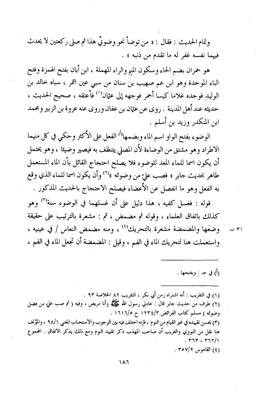 الوضوء بفتح الواو اسم الماء وبضمها (أ) الفعل على الأكثر وحكى في كل منهما الاطراد وهو مشتق من الوضاءة لأن المصلي يتنظف به فيصير وضيئا، وهو يحتمل أن يكون اسما للماء المعد للوضوء فلا يصلح احتجاج القائل بأن الماء المستعمل طاهر بحديث جابر "فصب عليَّ من وضوئه" (¬2) وأن يكون اسما للماء الذي وقع به الفعل وهو ما انفصل عن الأعضاء فيصلح الاحتجاج بالحديث المذكور.
