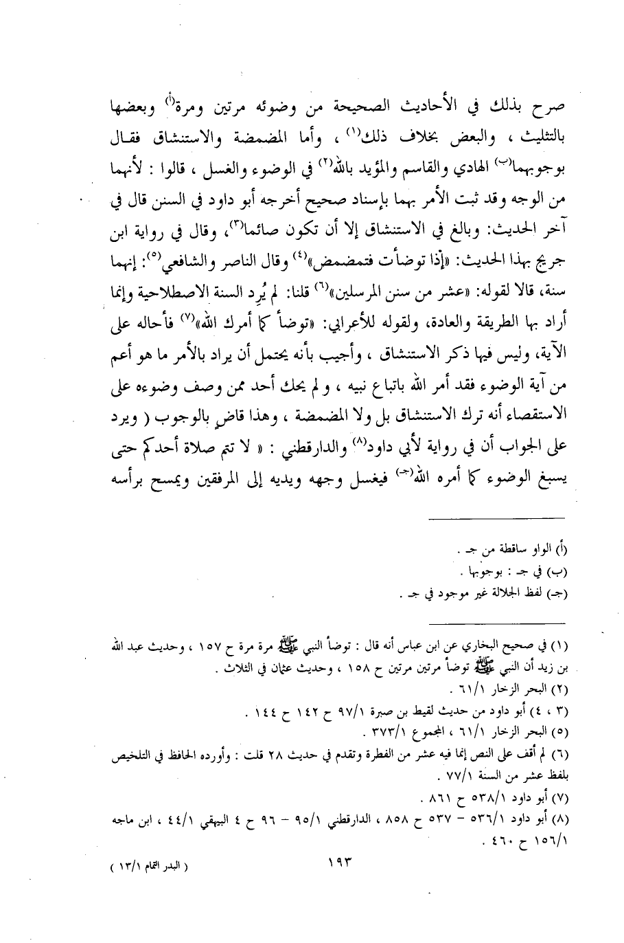 (¬1) في صحيح البخاري عن ابن عباس أنه قال: توضأ النبي - صلى الله عليه وسلم - مرة مرة ح 157، وحديث عبد الله بن زيد أن النبي - صلى الله عليه وسلم - توضأ مرتين مرتين ح 158، وحديث عثمان في الثلاث.