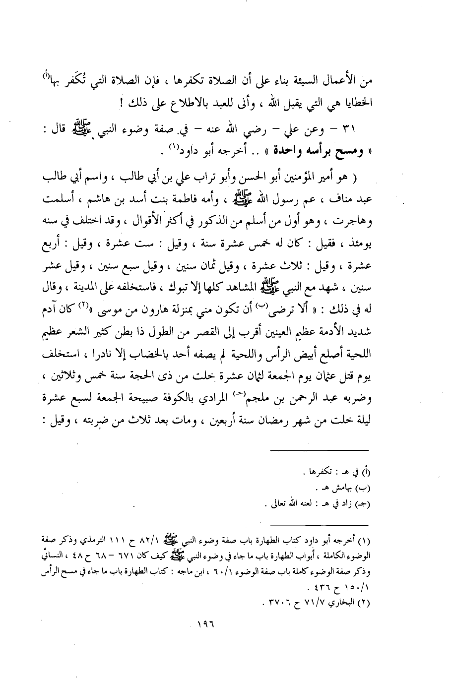 31 - وعن علي - رضي الله عنه - في. صفة وضوء النبي - صلى الله عليه وسلم - قال: "ومسح برأسه واحدة" .. أخرجه أبو داود (¬1).