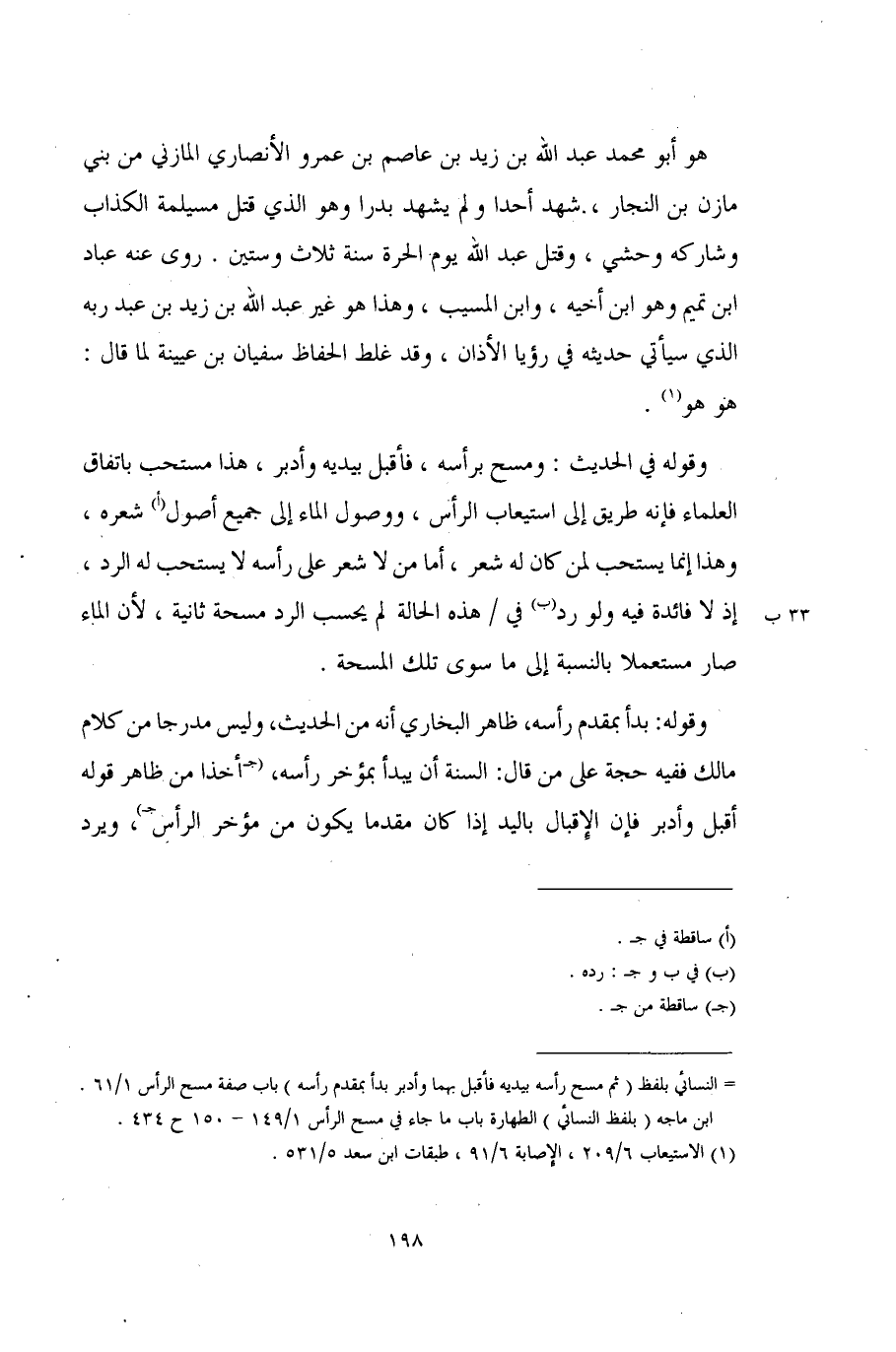 هو أبو محمد عبد الله بن زيد بن عاصم بن عمرو الأنصاري المازني من بني مازن بن النجار، شهد أحدا ولم يشهد بدرا وهو الذي قتل مسيلمة الكذاب وشاركه وحشي، وقتل عبد الله يوم الحرة سنة ثلاث وستين. روى عنه عباد بن تميم وهو ابن أخيه، وابن المسيب، وهذا هو غير عبد الله بن زيد بن عبد ربه الذي سيأتي حديثه في رؤيا الأذان، وقد غلط الحفاظ سفيان بن عيينة لما قال: هو هو (¬1).