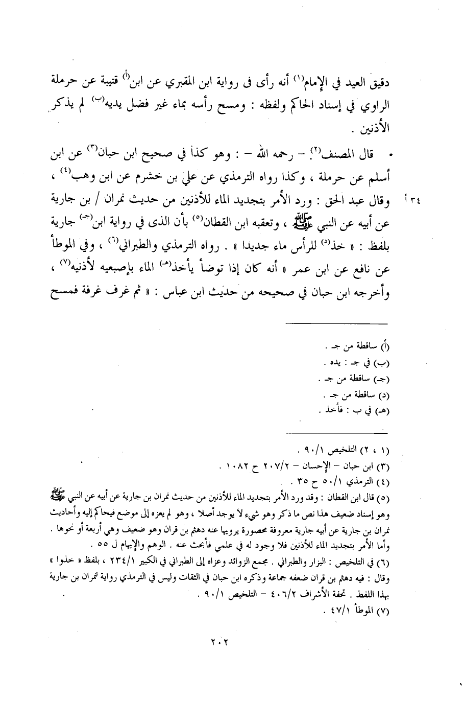 دقيق العيد في الإِمام (1) أنه رأى في رواية ابن المقبري عن ابن (أ) قتيبة عن حرملة الراوي في إسناد الحاكم ولفظه: ومسح رأسه بماء غير فضل يديه (ب) لم يذكر الأذنين.