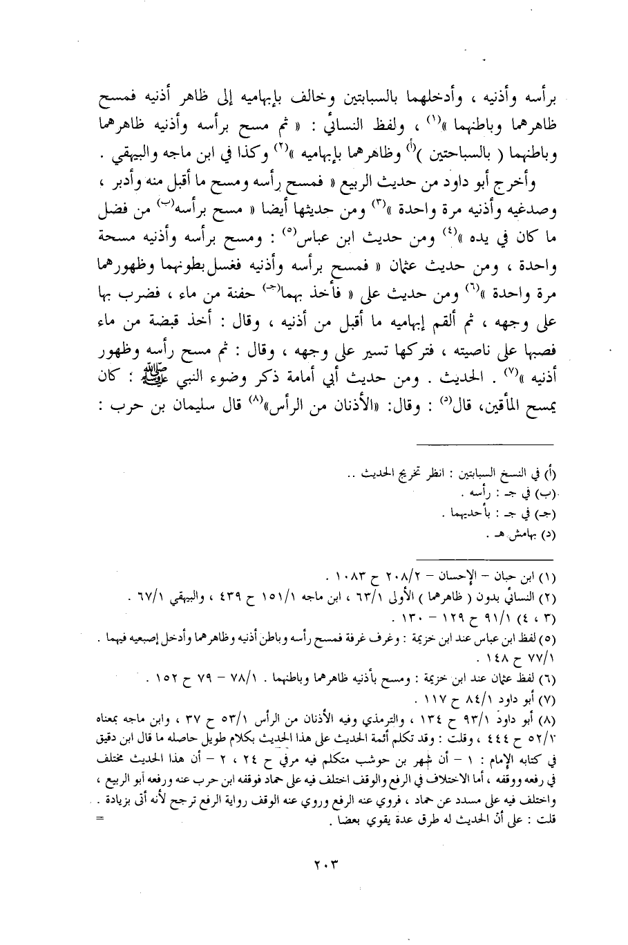 (¬6) لفظ عثمان عند ابن خزيمة: ومسح بأذنيه ظاهرهما وباطنهما. 1/ 78 - 71 ح 152.