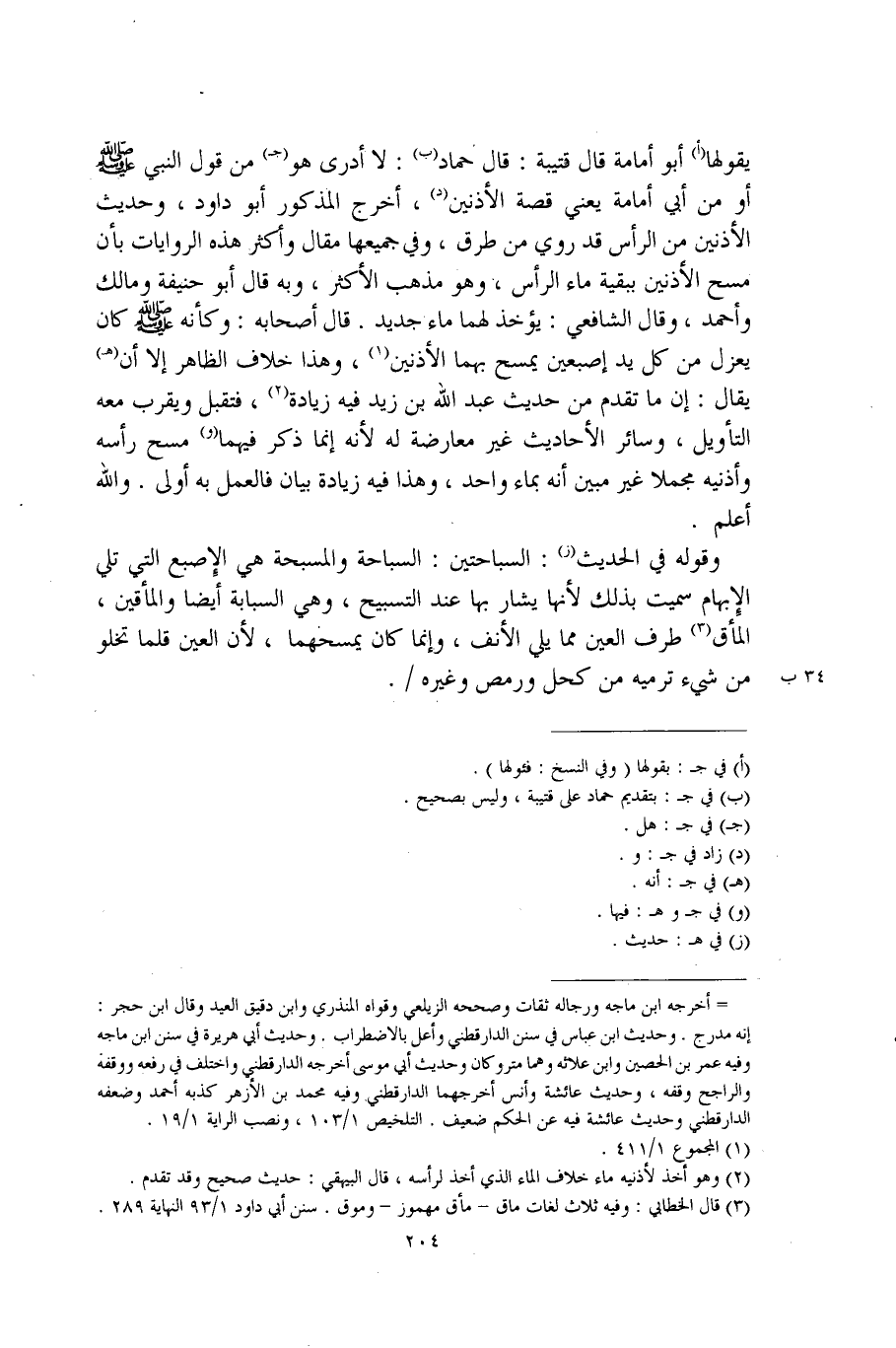 يقولها (أ) أبو أمامة قال قتيبة: قال حماد (ب): لا أدرى هو (جـ) من قول النبي - صلى الله عليه وسلم - أو من أبي أمامة يعني قصة الأذنين (د)، أخرج المذكور أبو داود، وحديث الأذنين من الرأس قد روي من طرق، وفي جميعها مقال وأكثر هذه الروايات بأن مسح الأذنين ببقية ماء الرأس، وهو مذهب الأكثر، وبه قال أبو حنيفة ومالك وأحمد، وقال الشافعي: يؤخذ لهما ماء جديد. قال أصحابه: وكأنه - صلى الله عليه وسلم - كان يعزل من كل يد إصبعين يمسح بهما الأذنين (¬1)، وهذا خلاف الظاهر إلا أن (هـ) يقال: إن ما تقدم من حديث عبد الله بن زيد فيه زيادة (¬2)، فتقبل ويقرب معه التأويل، وسائر الأحاديث غير معارضة له لأنه إنما ذكر فيهما (و) مسح رأسه وأذنيه مجملا غير مبين أنه بماء واحد، وهذا فيه زيادة بيان فالعمل به أولى. والله أعلم.