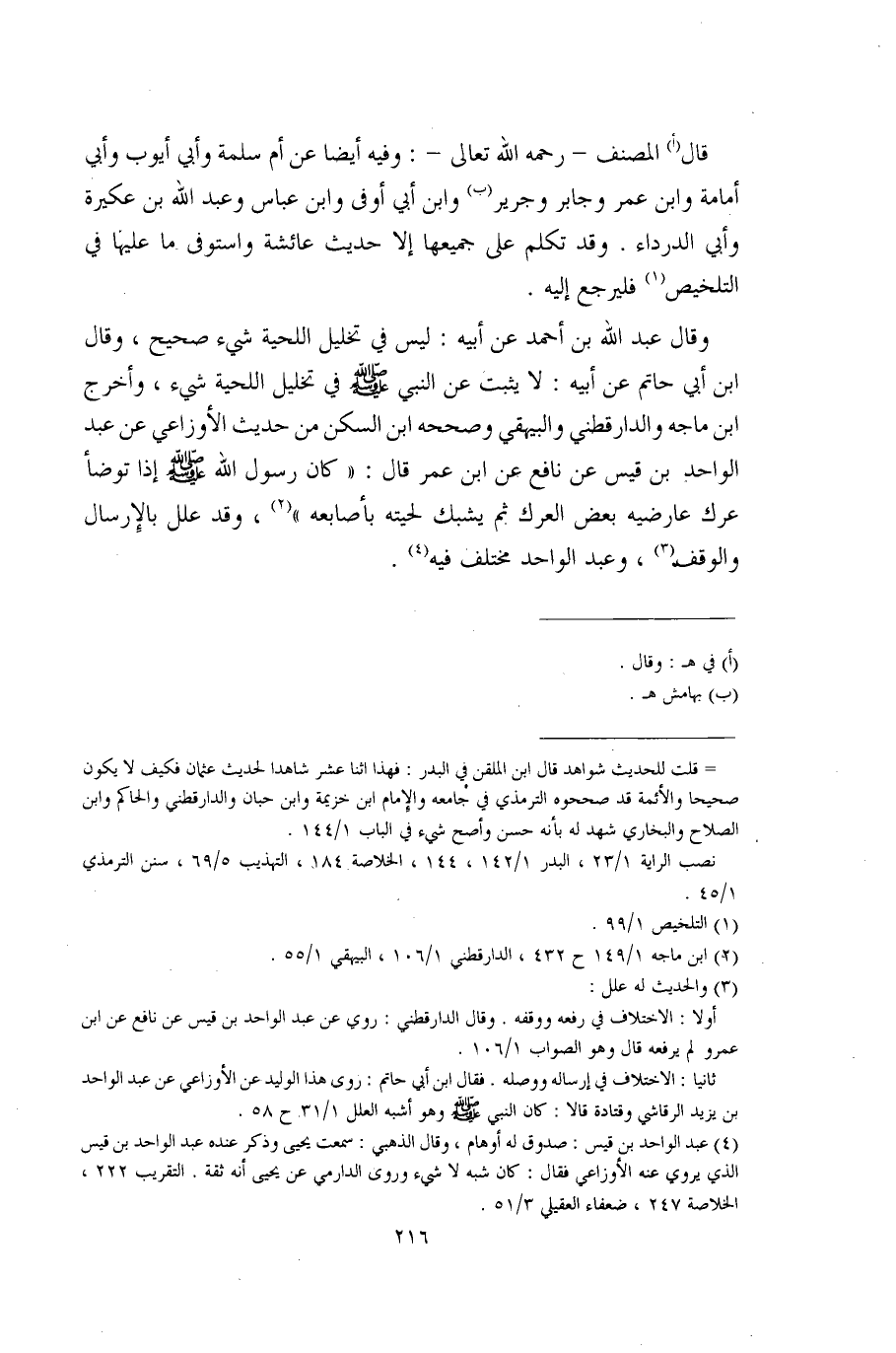 وقال عبد الله بن أحمد عن أبيه: ليس في تخليل اللحية شيء صحيح، وقال ابن أبي حاتم عن أبيه: لا يثبت عن النبي - صلى الله عليه وسلم - في تخليل اللحية شيء، وأخرج ابن ماجه والدارقطني والبيهقي وصححه ابن السكن من حديث الأوزاعي عن عبد الواحد بن قيس عن نافع عن ابن عمر قال: "كان رسول الله - صلى الله عليه وسلم - إذا توضأ عرك عارضيه بعض العرك ثم يشبك لحيته بأصابعه" (¬2)، وقد علل بالإِرسال والوقف (¬3)، وعبد الواحد مختلف فيه (¬4).
