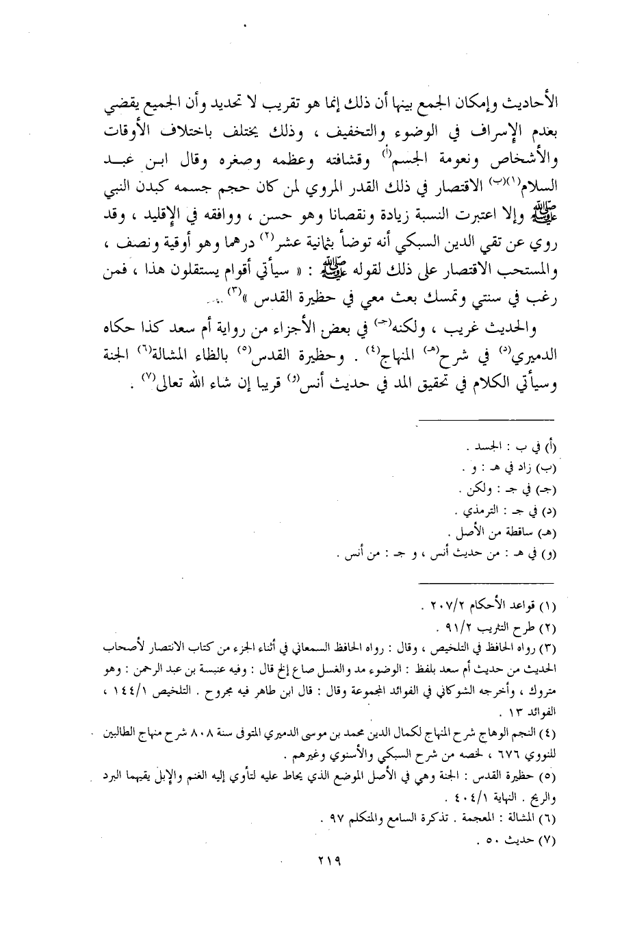 الأحاديث وإمكان الجمع بينها أن ذلك إنما هو تقريب لا تحديد وأن الجميع يقضي بعدم الإِسراف في الوضوء والتخفيف، وذلك يختلف باختلاف الأوقات والأشخاص ونعومة الجسم (أ) وقشافته وعظمه وصغره وقال ابن عبد السلام (¬1) (ب) الاقتصار في ذلك القدر المروي لمن كان حجم جسمه كبدن النبي - صلى الله عليه وسلم - وإلا اعتبرت النسبة زيادة ونقصانا وهو حسن، ووافقه في الإِقليد، وقد روي عن تقي الدين السبكي أنه توضأ بثمانية عشر (¬2) درهما وهو أوقية ونصف، والمستحب الاقتصار على ذلك لقوله - صلى الله عليه وسلم -: "سيأتي أقوام يستقلون هذا، فمن رغب في سنتي وتمسك بعث معي في حظيرة القدس" (¬3).