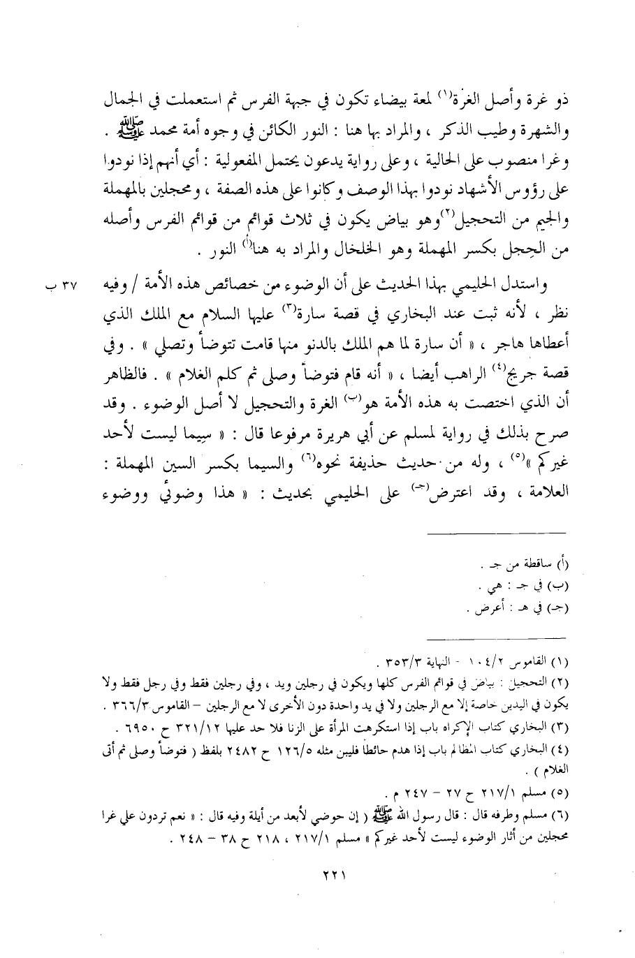 واستدل الحليمي بهذا الحديث على أن الوضوء من خصائص هذه الأمة وفيه نظر، لأنه ثبت عند البخاري في قصة سارة (¬3) عليها السلام مع الملك الذي أعطاها هاجر، "أن سارة لما هم الملك بالدنو منها قامت تتوضأ وتصلي". وفي قصة جريج (¬4) الراهب أيضًا، "أنه قام فتوضأ وصلى ثم كلم الغلام". فالظاهر أن الذي اختصت به هذه الأمة هو (ب) الغرة والتحجيل لا أصل الوضوء. وقد صرح بذلك في رواية لمسلم عن أبي هريرة مرفوعًا قال: "سِيما ليست لأحد غيركم" (¬5)، وله من حديث حذيفة نحوه (¬6) والسيما بكسر السين المهملة: العلامة، وقد اعترض (جـ) على الحليمي بحديث: "هذا وضوئي ووضوء