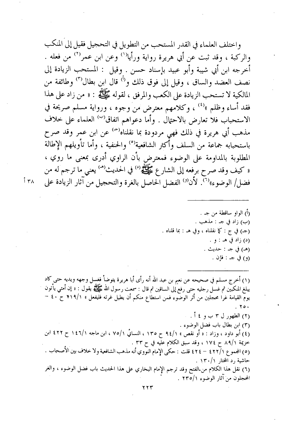 (¬1) أخرج مسلم في صحيحه عن نعيم بن عبد الله أنه رأى أبا هريرة يتوضأ فغسل وجهه ويديه حتى كاد يبلغ المنكبين ثم غسل رجليه حتى رفع إلى الساقين ثم قال: سمعت رسول الله - صلى الله عليه وسلم - يقول: "إن أمتي يأتون يوم القيامة غرا محجلين من أثر الوضوء فمن استطاع منكم أن يطيل غرته فليفعل" 1/ 219 ح 40 - 250.