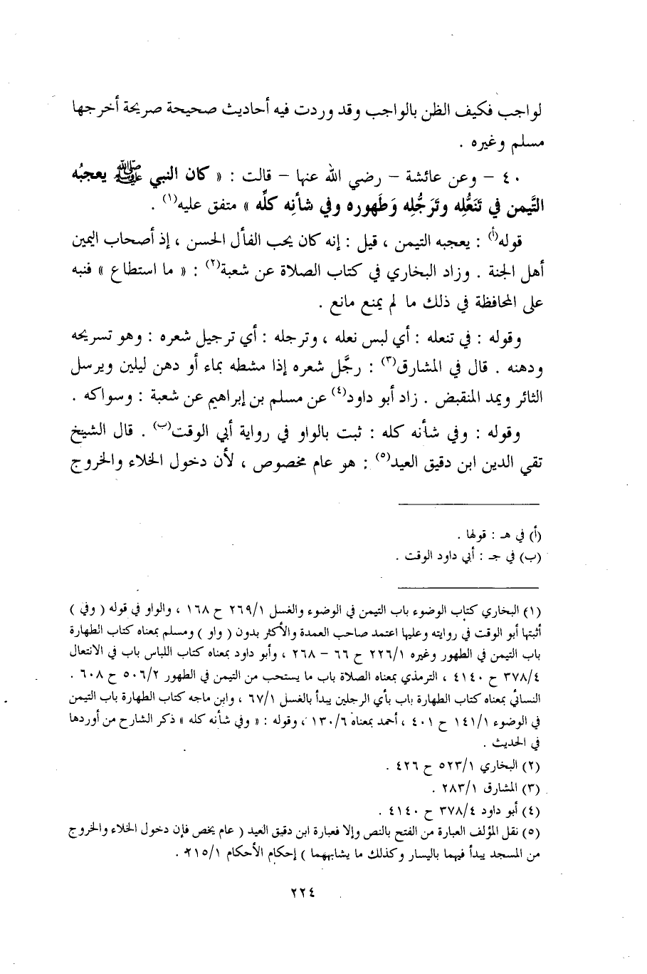 (¬5) نقل المؤلف العبارة من الفتح بالنص وإلا فعبارة ابن دقيق العيد (عام يخص فإن دخول الخلاء والخروج من المسجد يبدأ فيهما باليسار وكذلك ما يشابهما) إحكام الأحكام 1/ 215.