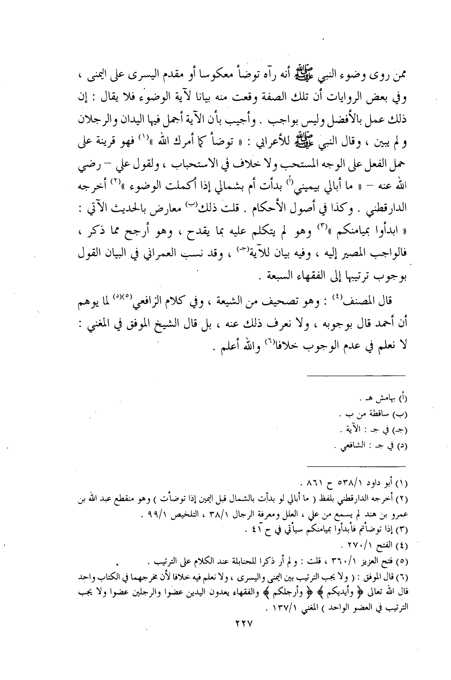 ممن روى وضوء النبي - صلى الله عليه وسلم - أنه رآه توضأ معكوسا أو مقدم اليسرى على اليمني، وفي بعض الروايات أن تلك الصفة وقعت منه بيانا لآية الوضوء فلا يقال: إن ذلك عمل بالأفضل وليس بواجب. وأجيب بأن الآية أجمل فيها اليدان والرجلان ولم يبين، وقال النبي - صلى الله عليه وسلم - للأعرابي: "توضأ كما أمرك الله" (¬1) فهو قرينة على حمل الفعل على الوجه المستحب ولا خلاف في الاستحباب، ولقول علي - رضي الله عنه - "ما أبالي بيميني (أ) بدأت أم بشمالي إذا أكملت الوضوء" (¬2) أخرجه الدارقطني. وكذا في أصول الأحكام. قلت ذلك (ب) معارض بالحديث الآتي: "ابدأوا بميامنكم" (¬3) وهو لم يتكلم عليه بما يقدح، وهو أرجح مما ذكر، فالواجب المصير إليه، وفيه بيان للآية (جـ)، وقد نسب العمراني في البيان القول بوجوب ترتيبها إلى الفقهاء السبعة.