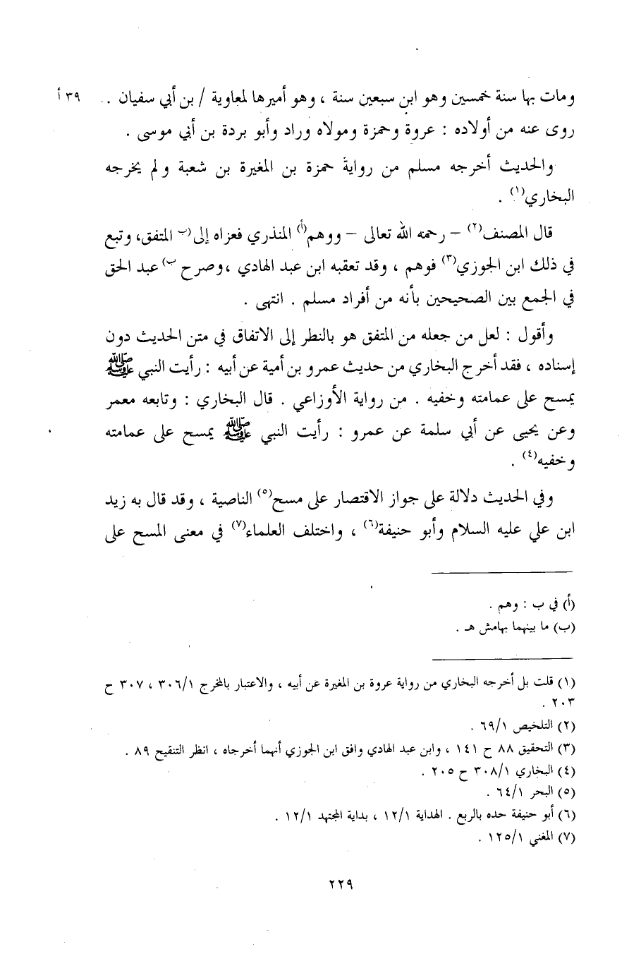 وأقول: لعل من جعله من المتفق هو بالنطر إلى الاتفاق في متن الحديث دون إسناده، فقد أخرج البخاري من حديث عمرو بن أمية عن أبيه: رأيت النبي - صلى الله عليه وسلم - يمسح على عمامته وخفيه. من رواية الأوزاعي. قال البخاري: وتابعه معمر وعن يحيى عن أبي سلمة عن عمرو: رأيت النبي - صلى الله عليه وسلم - يمسح على عمامته وخفيه (¬4).