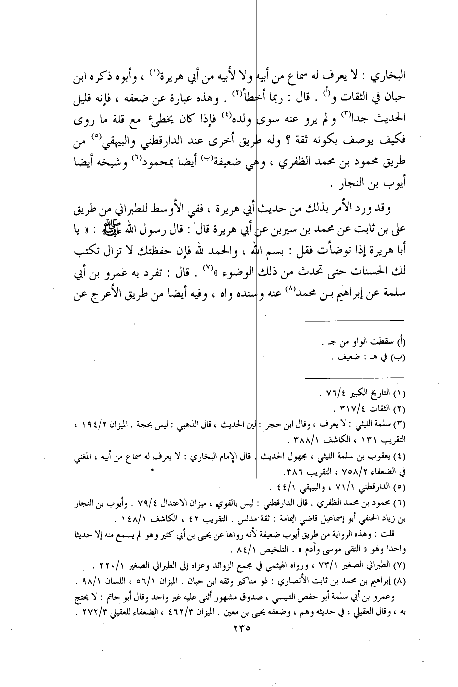 (¬6) محمود بن محمد الظفري. قال الدارقطني: ليس بالقوي، ميزان الاعتدال 4/ 79. وأيوب بن النجار بن زياد الحنفي أبو إسماعيل قاضي اليمامة: ثقة مدلس. التقريب 42، الكاشف 1/ 148.