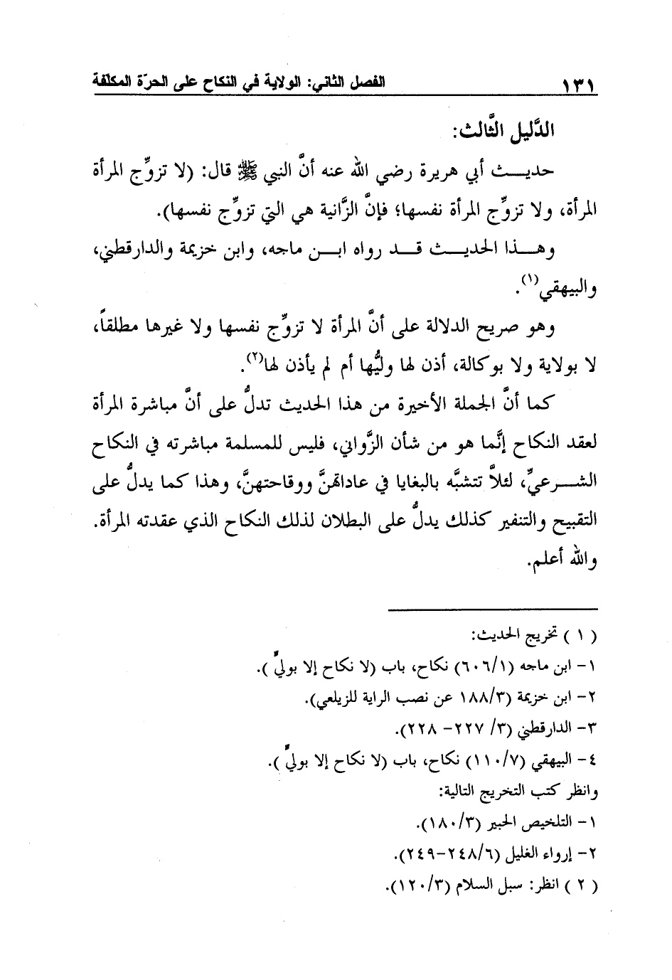 حديث أبي هريرة رضي الله عنه أنَّ النبي صلى الله عليه وسلم قال: "لا تزوِّج المرأة المرأة، ولا تزوِّج المرأة نفسها؛ فإنَّ الزَّانية هي التي تزوِّج نفسها".