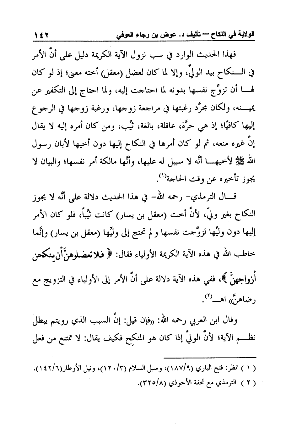 قال الترمذي- رحمه الله- في هذا الحديث دلالة على أنَّه لا يجوز النكاح بغير وليّ، لأنَّ أخت "معقل بن يسار" كانت ثيِّباً، فلو كان الأمر إليها دون وليِّها لزوَّجت نفسها ولم تحتج إلى وليِّها "معقل بن يسار" وإنَّما خاطب الله في هذه الآية الكريمة الأولياء فقال: {فَلا تَعْضُلُوهُنَّ أَنْ يَنْكِحْنَ أَزْوَاجَهُنّ} ، ففي هذه الآية دلالة على أنَّ الأمر إلى الأولياء في التزويج مع رضاهنَّ" اهـ2.