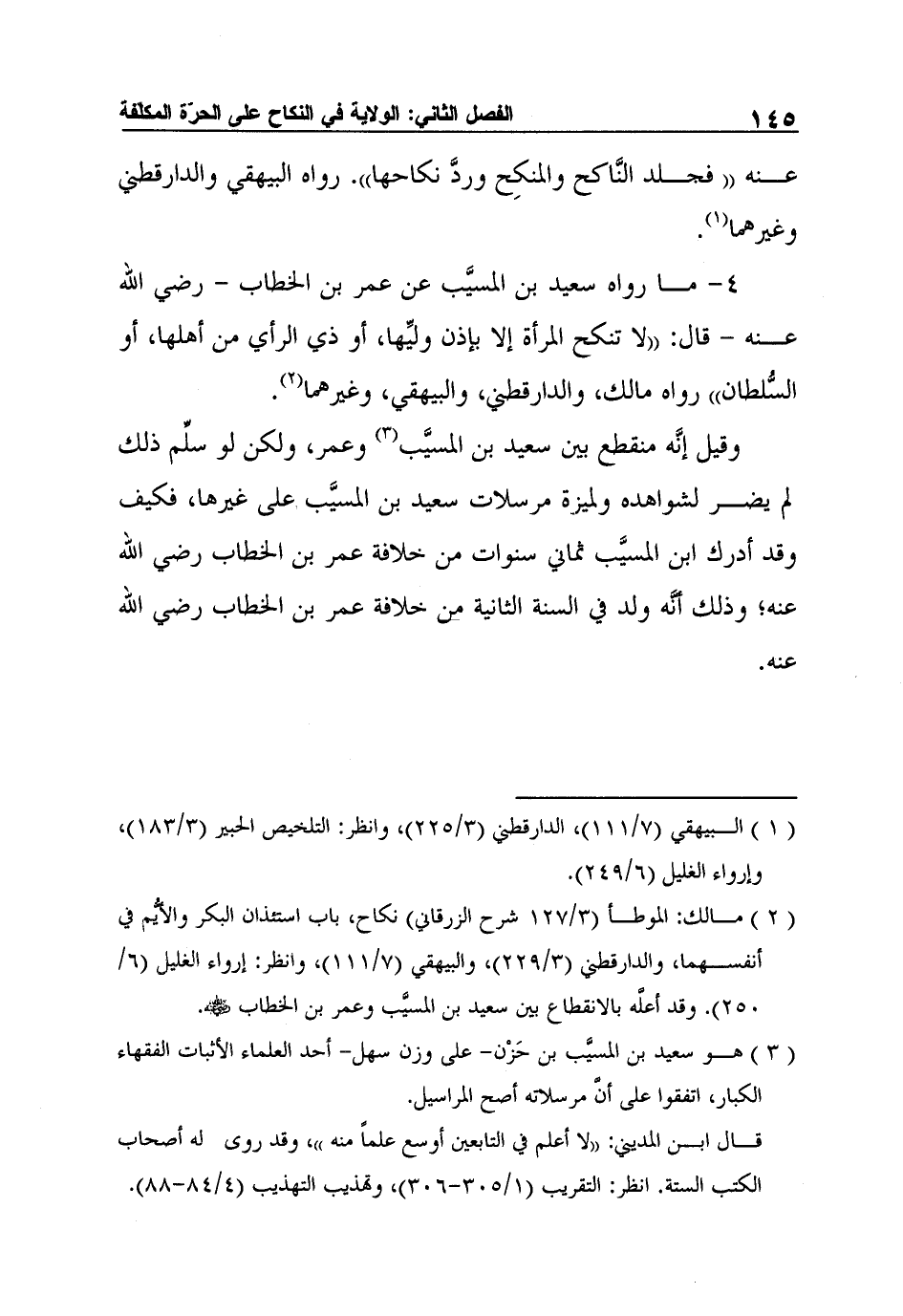 4- ما رواه سعيد بن المسيَّب عن عمر بن الخطاب - رضي الله عنه - قال: "لا تنكح المرأة إلا بإذن وليِّها، أو ذي الرأي من أهلها، أو السُّلطان" رواه مالك، والدارقطني، والبيهقي، وغيرهما2.