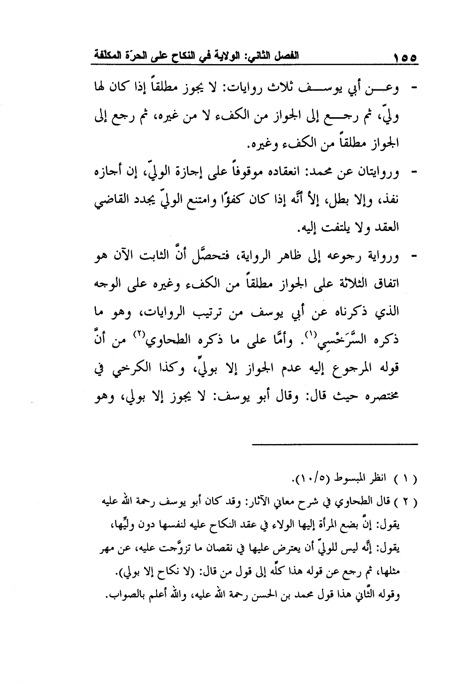 2 قال الطحاوي في شرح معاني الآثار: وقد كان أبو يوسف رحمة الله عليه يقول: إنَّ بضع المرأة إليها الولاء في عقد النكاح عليه لنفسها دون وليِّها، يقول: إنَّه ليس للوليّ أن يعترض عليها في نقصان ما تزوَّجت عليه، عن مهر مثلها، ثم رجع عن قوله هذا كلِّه إلى قول من قال: "لا نكاح إلا بولي". وقوله الثَّاني هذا قول محمد بن الحسن رحمة الله عليه، والله أعلم بالصواب.