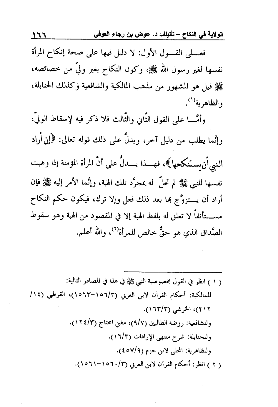 وأمَّا على القول الثَّاني والثَّالث فلا ذكر فيه لإسقاط الوليّ، وإنَّما يطلب من دليل آخر، ويدلُّ على ذلك قوله تعالى: {إِنْ أَرَادَ النَّبِيُّ أَنْ يَسْتَنْكِحَهَا} ، فهذا يدلُّ على أنَّ المرأة المؤمنة إذا وهبت نفسها للنبي صلى الله عليه وسلم لم تحلّ له بمجرَّد تلك الهبة، وإنَّما الأمر إليه صلى الله عليه وسلم فإن أراد أن يتزوَّج بها بعد ذلك فعل وإلا ترك، فيكون حكم النكاح مستأنفاً لا تعلق له بلفظ الهبة إلا في المقصود من الهبة وهو سقوط الصَّداق الذي هو حقٌّ خالص للمرأة2، والله أعلم.