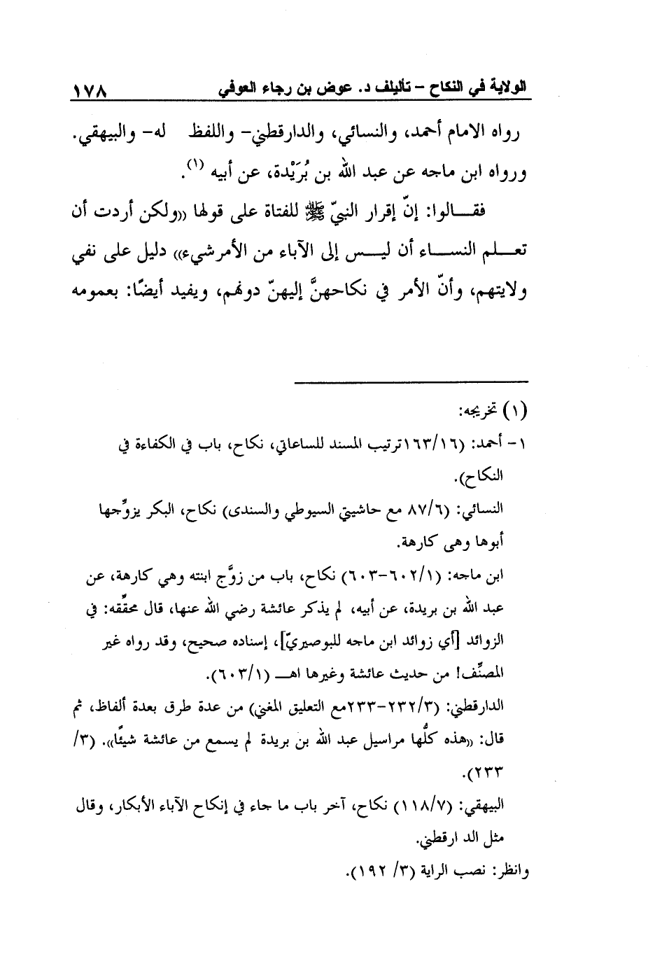ابن ماجه: (1/602-603) نكاح، باب من زوَّج ابنته وهي كارهة، عن عبد الله بن بريدة، عن أبيه، لم يذكر عائشة رضي الله عنها، قال محقِّقه: في الزوائد [أي زوائد ابن ماجه للبوصيريّ] ، إسناده صحيح، وقد رواه غير المصنِّف! من حديث عائشة وغيرها اهـ (1/603) .