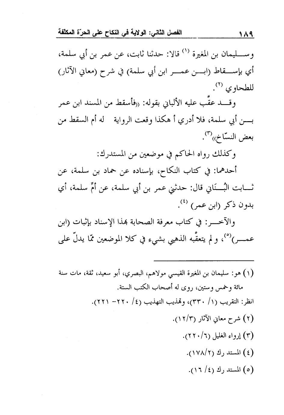 وسليمان بن المغيرة1 قالا: حدثنا ثابت، عن عمر بن أبي سلمة، أي بإسقاط (ابن عمر ابن أبي سلمة) في شرح (معاني الآثار) للطحاوي2.