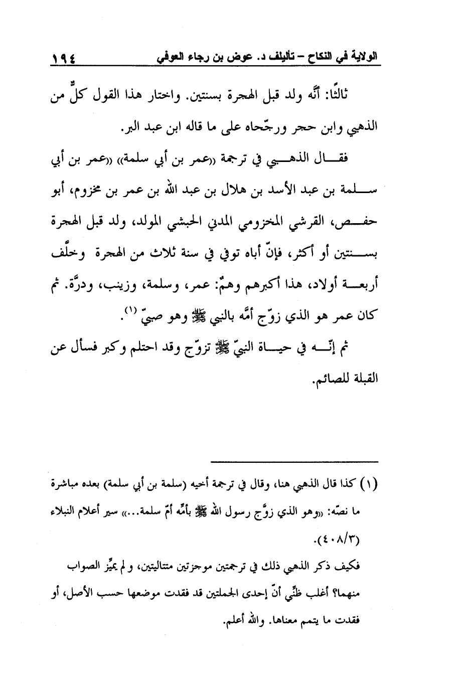 فقال الذهبي في ترجمة "عمر بن أبي سلمة" "عمر بن أبي سلمة بن عبد الأسد بن هلال بن عبد الله بن عمر بن مخزوم، أبو حفص، القرشي المخزومي المدني الحبشي المولد، ولد قبل الهجرة بسنتين أو أكثر، فإنّ أباه توفي في سنة ثلاث من الهجرة وخلَّف أربعة أولاد، هذا أكبرهم وهمٌ: عمر، وسلمة، وزينب، ودرَّة. ثم كان عمر هو الذي زوّج أمَّه بالنبي صلى الله عليه وسلم وهو صبيّ1.
