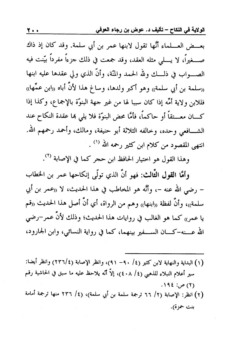 بعض العلماء أنَّها تقول لابنها عمر بن أبي سلمة. وقد كان إذ ذاك صغيراً، لا يلي مثله العقد، وقد جمعت في ذلك جزءاً مفرداً بيّنت فيه الصواب في ذلك ولله الحمد والمنّة، وأنّ الذي ولي عقدها عليه ابنها "سلمة بن أبي سلمة" وهو أكبر ولدها، وساغ هذا لأنَّ أباه "ابن عمِّها" فالابن ولاية أمِّه إذا كان سببا لها من غير جهة البنوّة بالإجماع، وكذا إذا كان معتقاً أو حاكماً، فأمَّا محض البنوّة فلا يلي بها عقدة النكاح عند الشافعي وحده، وخالفه الثلاثة أبو حنيفة، ومالك، وأحمد رحمهم الله. انتهى المقصود من كلام ابن كثير رحمه الله1.