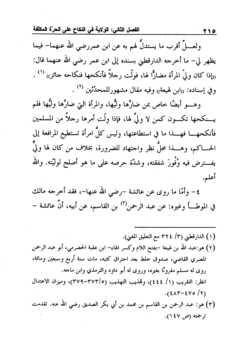 ولعلَّ أقرب ما يستدلُّ لهم به عن ابن عمررضي الله عنهما- فيما يظهر لي- ما أخرجه الدارقطني بسنده إلى ابن عمر رضي الله عنهما قال: "إذا كان وليّ المرأة مضارًّا لها، فولّت رجلاً فأنكحها فنكاحه جائز"1. وفي إسناده: "ابن لهيعة" وفيه مقال مشهورللمحدّثين2.