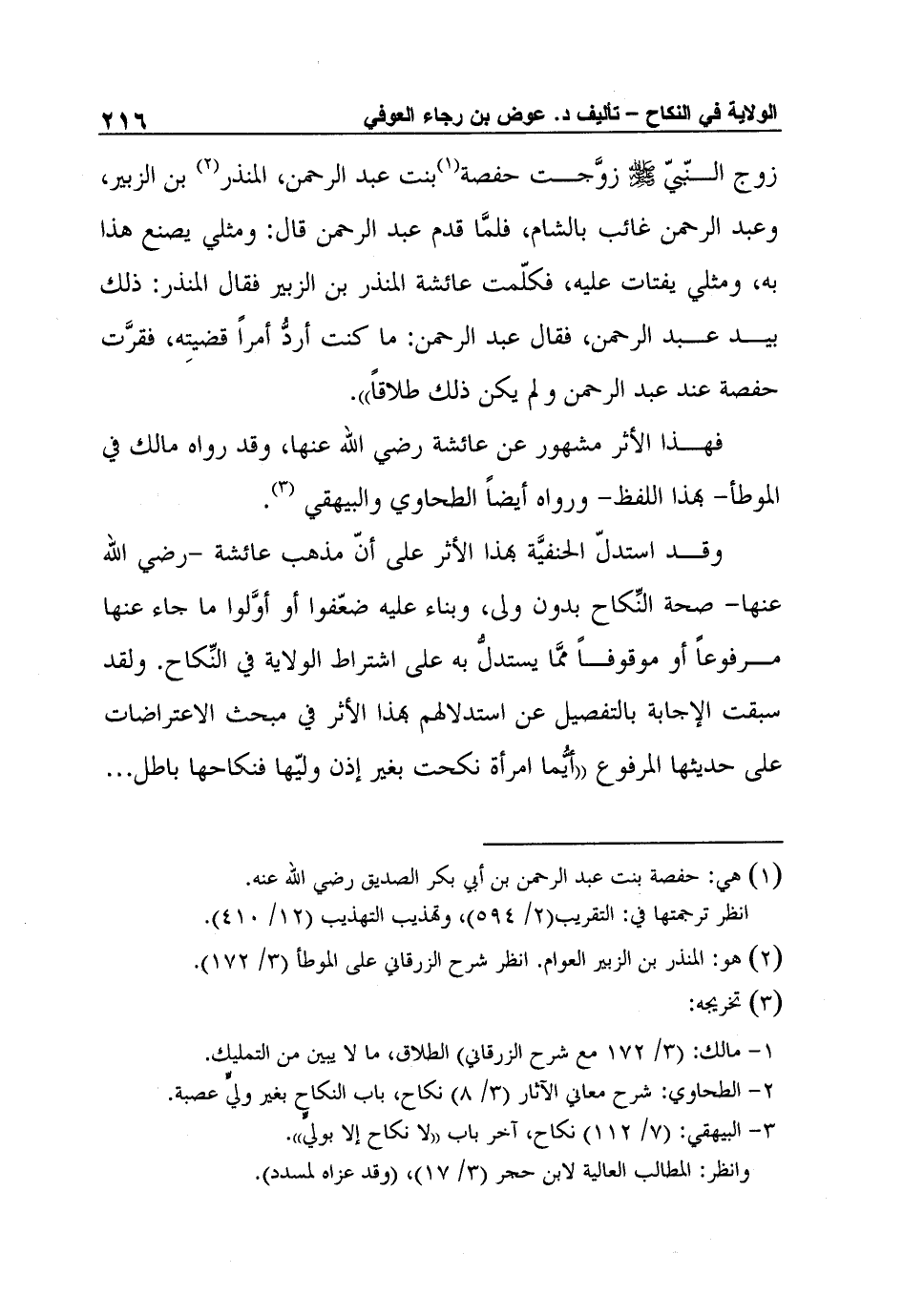 زوج النّبيّ صلى الله عليه وسلم زوَّجت حفصة1 بنت عبد الرحمن، المنذر2 بن الزبير، وعبد الرحمن غائب بالشام، فلمَّا قدم عبد الرحمن قال: ومثلي يصنع هذا به، ومثلي يفتات عليه، فكلّمت عائشة المنذر بن الزبير فقال المنذر: ذلك بيد عبد الرحمن، فقال عبد الرحمن: ما كنت أردُّ أمراً قضيتِه، فقرَّت حفصة عند عبد الرحمن ولم يكن ذلك طلاقاً".