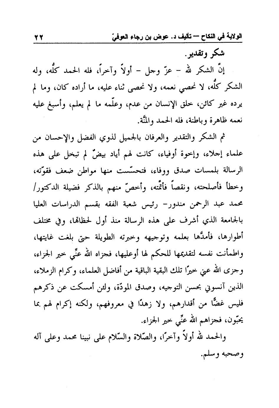ثم الشكر والتقدير والعرفان بالجميل لذوي الفضل والإحسان من علماء إجلاء، وإخوة أوفياء، كانت لهم أياد بيضٌ لم تبخل على هذه الرسالة بلمسات صدق ووفاء، فتحسّست منها مواطن ضعف فقوّته، وخطأ فأصلحته، ونقصاً فأتمَّته، وأخصّ منهم بالذكر فضيلة الدكتور/ محمد عبد الرحمن مندور- رئيس شعبة الفقه بقسم الدراسات العليا بالجامعة الذي أشرف على هذه الرسالة منذ أول لحظاتها، وفي مختلف أطوارها، فأمدَّها بعلمه وتوجيهه وخبرته الطويلة حتى بلغت غايتها، واطمأنت نفسه لتقديمها للحكم لها أوعليها، فجزاه الله عنِّي خير الجزاء، وجزى الله عني خيرًا تلك البقية الباقية من أفاضل العلماء، وكرام الزملاء، الذين آنسوني بحسن التوجيه، وصدق المودّة، ولئن أمسكت عن ذكرهم فليس غضًّا من أقدارهم، ولا زهدًا في معروفهم، ولكنه إكرام لهم بما يحبّون، فجزاهم الله عنِّي خير الجزاء.