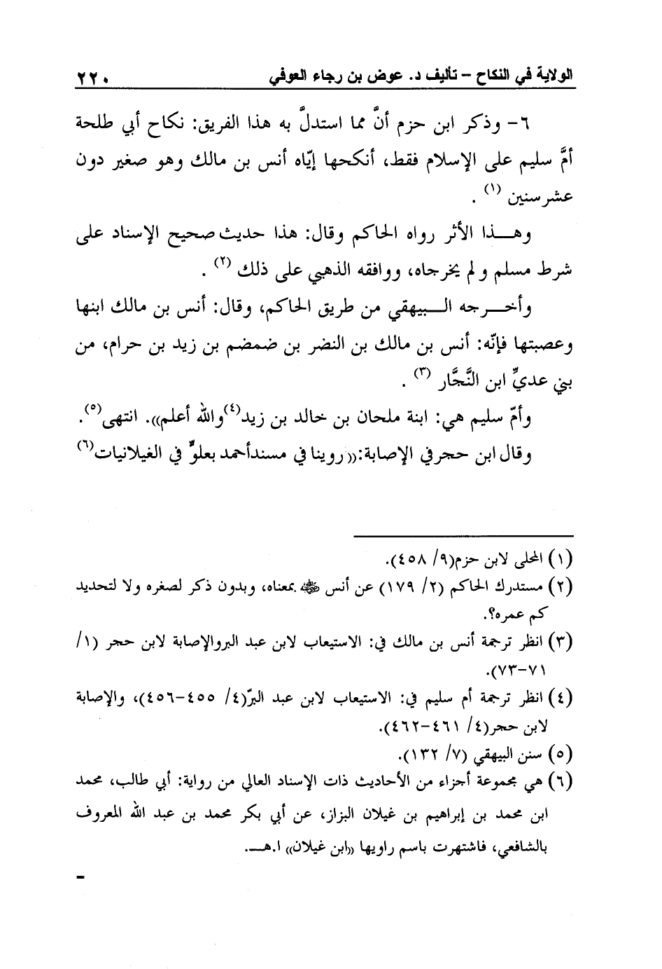 6- وذكر ابن حزم أنَّ مما استدلَّ به هذا الفريق: نكاح أبي طلحة أمَّ سليم على الإسلام فقط، أنكحها إيّاه أنس بن مالك وهو صغير دون عشرسنين1.