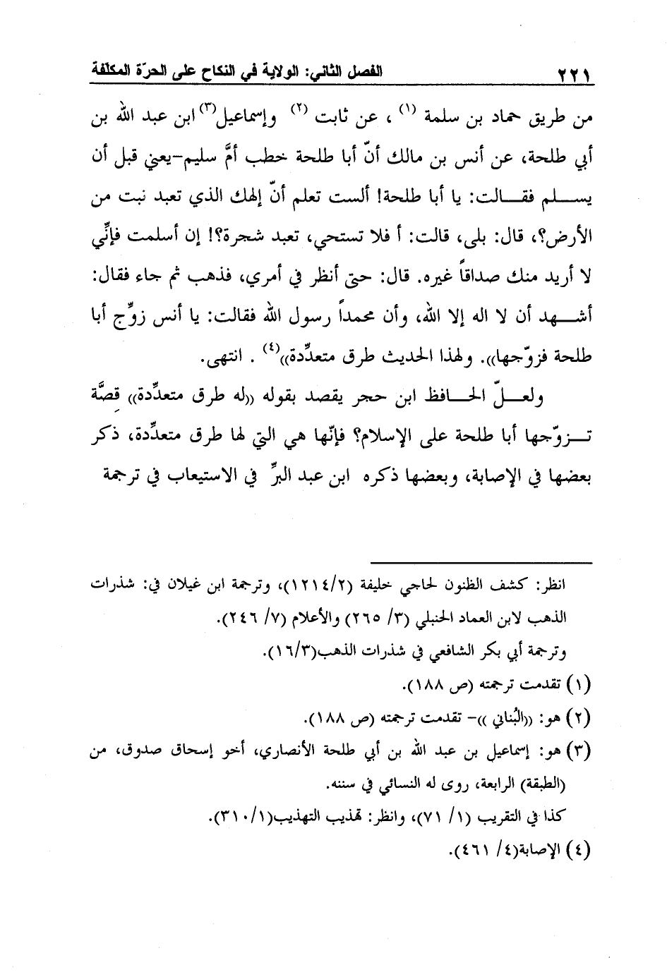 من طريق حماد بن سلمة1، عن ثابت2 وإسماعيل3 ابن عبد الله بن أبي طلحة، عن أنس بن مالك أنّ أبا طلحة خطب أمَّ سليم-يعني قبل أن يسلم فقالت: يا أبا طلحة! ألست تعلم أنّ إلهك الذي تعبد نبت من الأرض؟، قال: بلى، قالت: أفلا تستحي، تعبد شجرة؟! إن أسلمت فإنِّي لا أريد منك صداقاً غيره. قال: حتى أنظر في أمري، فذهب ثم جاء فقال: أشهد أن لا اله إلا الله، وأن محمداً رسول الله فقالت: يا أنس زوِّج أبا طلحة فزوّجها". ولهذا الحديث طرق متعدِّدة"4. انتهى.