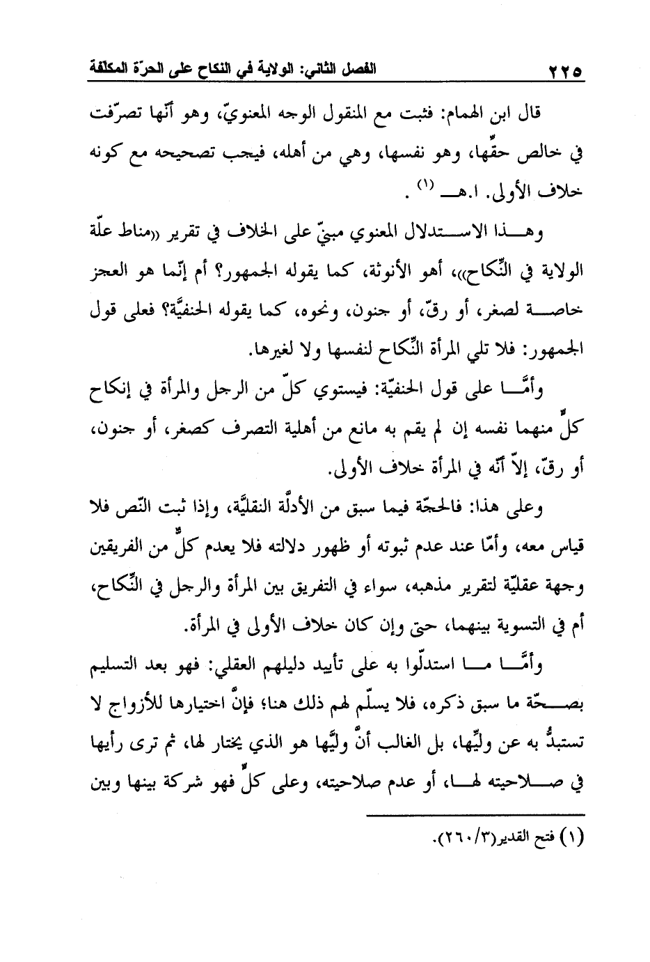 وعلى هذا: فالحجّة فيما سبق من الأدلَّة النقليَّة، وإذا ثبت النّص فلا قياس معه، وأمّا عند عدم ثبوته أو ظهور دلالته فلا يعدم كلٌّ من الفريقين وجهة عقليّة لتقرير مذهبه، سواء في التفريق بين المرأة والرجل في النِّكاح، أم في التسوية بينهما، حتى وإن كان خلاف الأولى في المرأة.