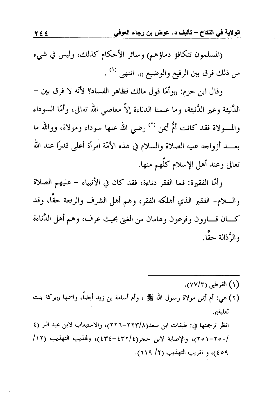 وقال ابن حزم: "وأمّا قول مالك فظاهر الفساد؟ لأنّه لا فرق بين - الدَّنيئة وغير الدَّنيئة، وما علمنا الدناءة إلاّ معاصي الله تعالى، وأمّا السوداء والمولاة فقد كانت أمُّ أيمن2 رضي الله عنها سوداء ومولاة، ووالله ما بعد أزواجه عليه الصلاة والسلام في هذه الأمّة امرأة أعلى قدرًا عند الله تعالى وعند أهل الإسلام كلِّهم منها.