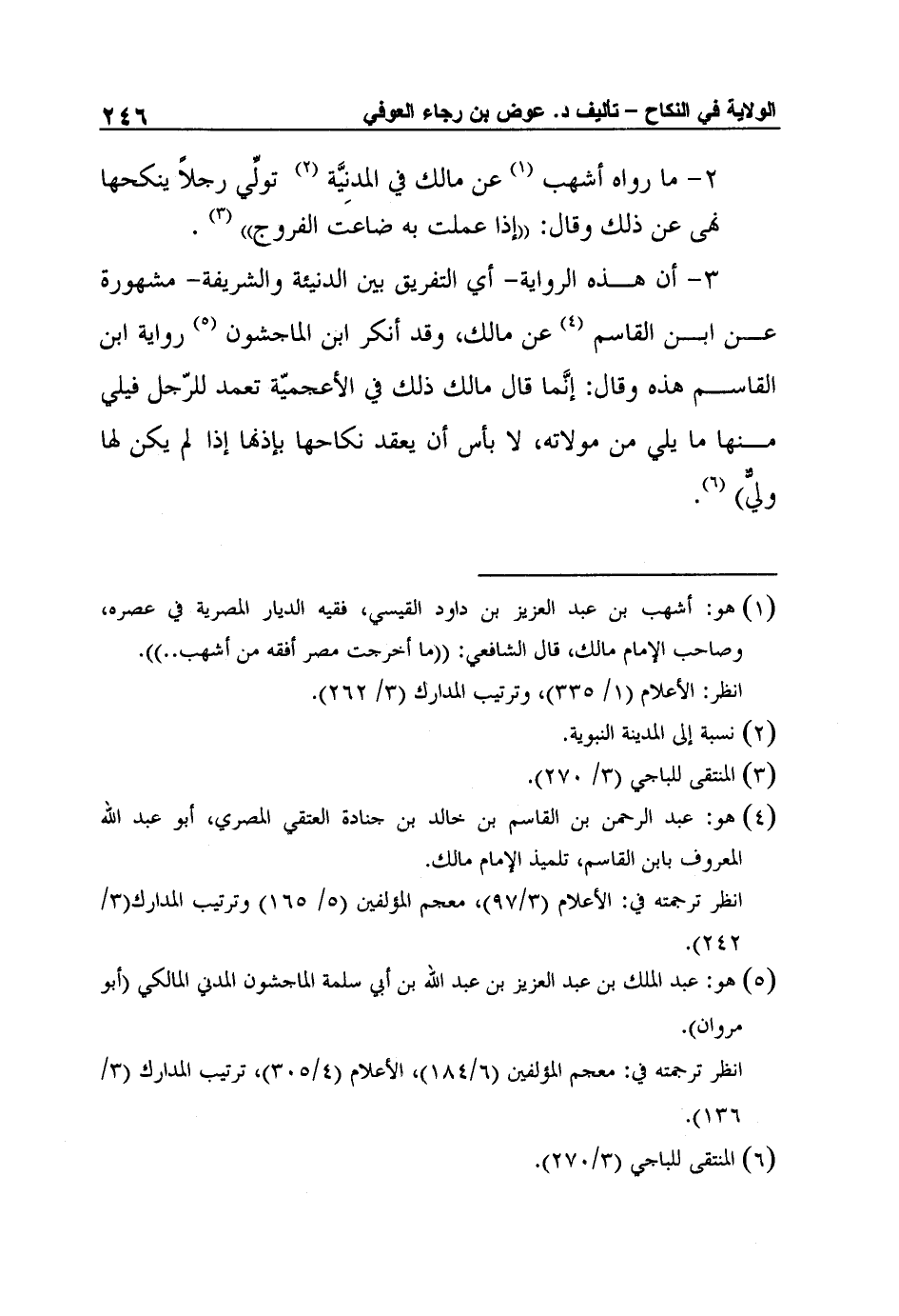 3- أن هذه الرواية- أي التفريق بين الدنيئة والشريفة- مشهورة عن ابن القاسم4 عن مالك، وقد أنكر ابن الماجشون5 رواية ابن القاسم هذه وقال: إنَّما قال مالك ذلك في الأعجميّة تعمد للرّجل فيلي منها ما يلي من مولاته، لا بأس أن يعقد نكاحها بإذنها إذا لم يكن لها وليٌّ) 6.