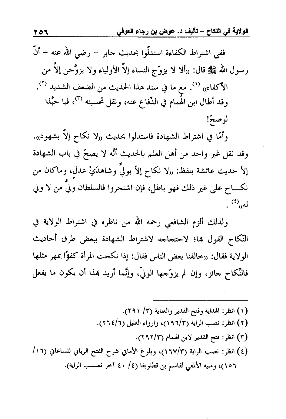 ولذلك ألزم الشافعي رحمه الله من ناظره في اشتراط الولاية في النّكاح القول بها؛ لاحتجاجه لاشتراط الشهادة ببعض طرق أحاديث الولاية فقال: "خالفنا بعض الناس فقال: إذا نكحت المرأة كفؤًا بمهر مثلها فالنِّكاح جائز، وإن لم يزوّجها الوليّ، وإنَّما أريد بهذا أن يكون ما يفعل