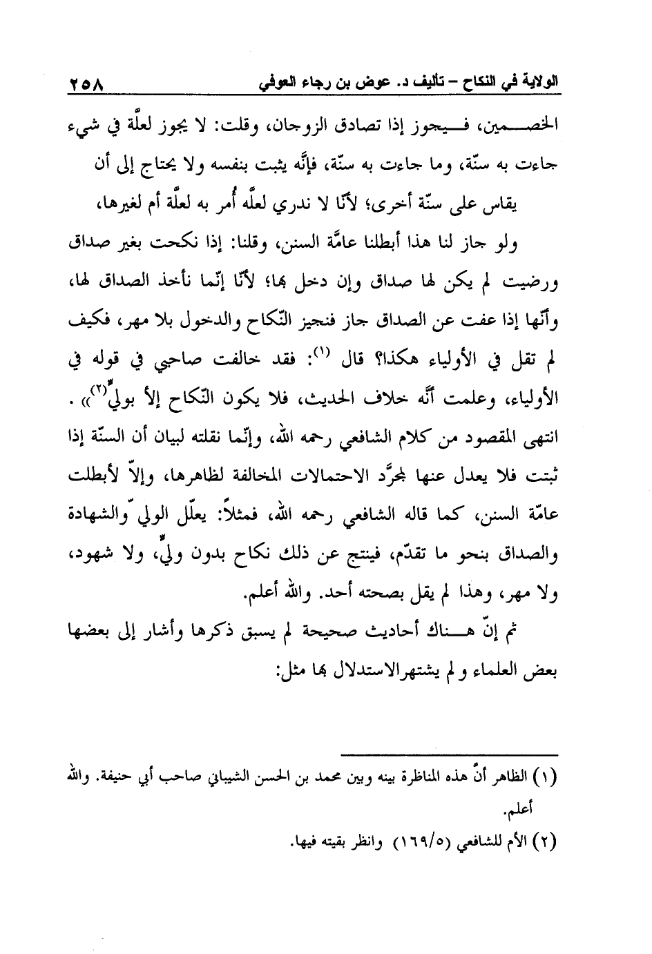 ولو جاز لنا هذا أبطلنا عامَّة السنن، وقلنا: إذا نكحت بغير صداق ورضيت لم يكن لها صداق وإن دخل بها؛ لأنّا إنّما نأخذ الصداق لها، وأنّها إذا عفت عن الصداق جاز فنجيز النّكاح والدخول بلا مهر، فكيف لم تقل في الأولياء هكذا؟ قال1: فقد خالفت صاحبي في قوله في الأولياء، وعلمت أنَّه خلاف الحديث، فلا يكون النّكاح إلأ بوليٍّ2". انتهى المقصود من كلام الشافعي رحمه الله، وإنّما نقلته لبيان أن السنّة إذا ثبتت فلا يعدل عنها لمجرَّد الاحتمالات المخالفة لظاهرها، وإلاّ لأبطلت عامّة السنن، كما قاله الشافعي رحمه الله، فمثلاً: يعلّل الولي ّوالشهادة والصداق بنحو ما تقدّم، فينتج عن ذلك نكاح بدون وليٍّ، ولا شهود، ولا مهر، وهذا لم يقل بصحته أحد. والله أعلم.
