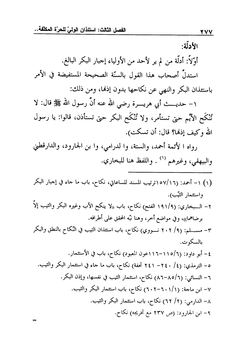 1- حديث أبي هريرة رضي الله عنه أنَّ رسول الله صلى الله عليه وسلم قال: "لا تُنْكَح الأيِّم حتى تستأمر، ولا تُنْكَح البكر حتى تستأذن، قالوا: يا رسول الله وكيف إذنها؟ قال: أن تسكت".