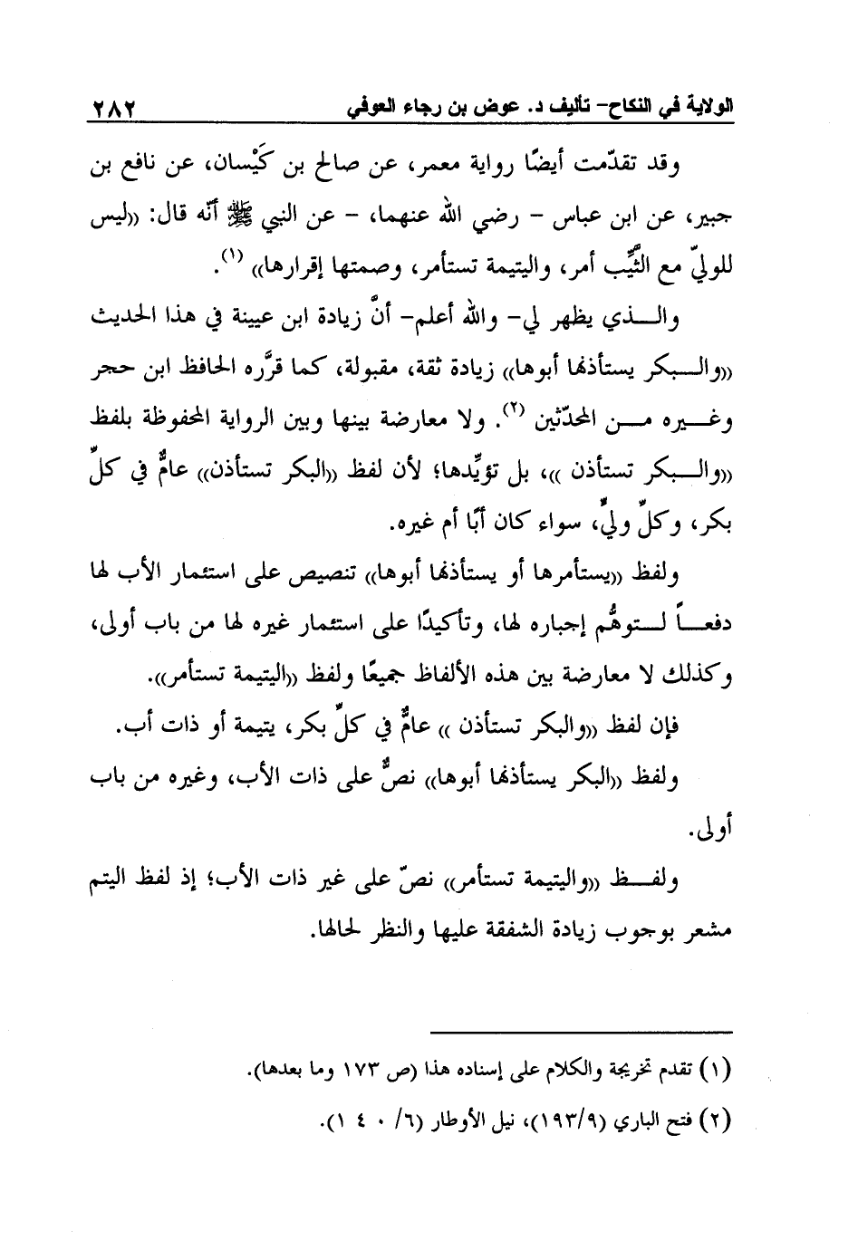 والذي يظهر لي- والله أعلم- أنَّ زيادة ابن عيينة في هذا الحديث "والبكر يستأذنها أبوها" زيادة ثقة، مقبولة، كما قرَّره الحافظ ابن حجر وغيره من المحدّثين2. ولا معارضة بينها وبين الرواية المحفوظة بلفظ "والبكر تستأذن"، بل تؤيِّدها؛ لأن لفظ "البكر تستأذن" عامٌّ في كلِّ بكر، وكلِّ وليٍّ، سواء كان أبًا أم غيره.