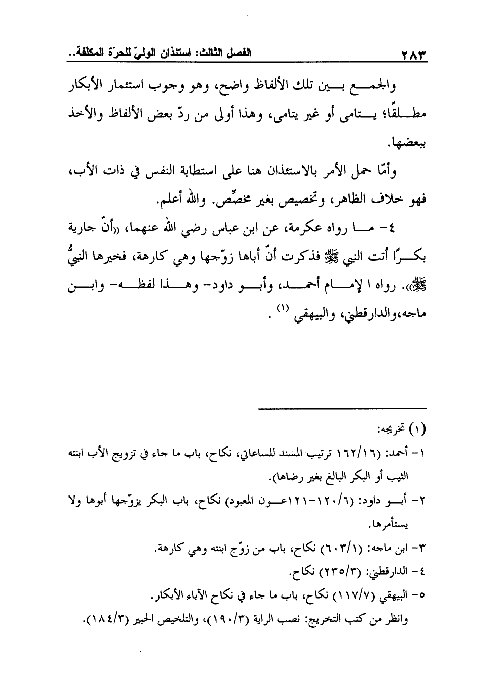 2- أبو داود: (6/120-121عون المعبود) نكاح، باب البكر يزوّجها أبوها ولا يستأمرها.