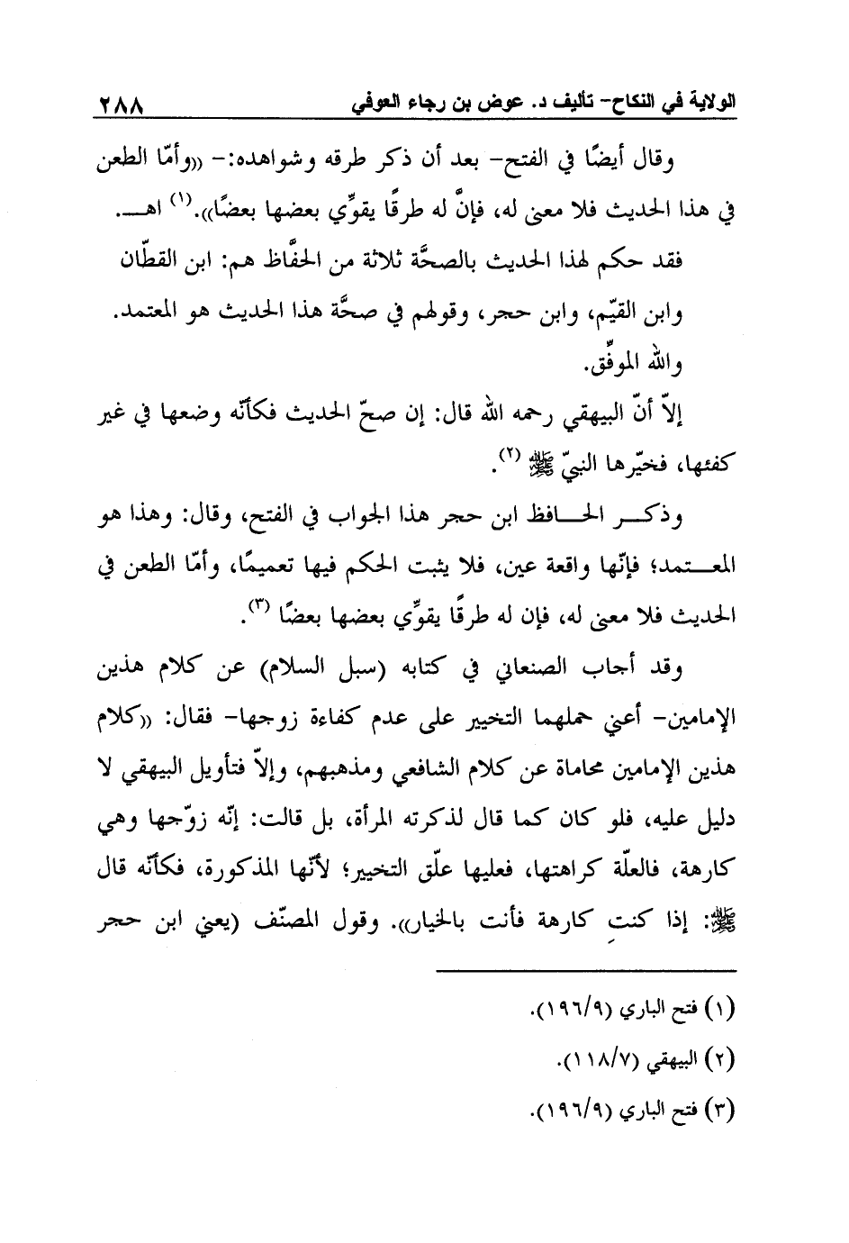 وقد أجاب الصنعاني في كتابه (سبل السلام) عن كلام هذين الإمامين- أعني حملهما التخيير على عدم كفاءة زوجها- فقال: "كلام هذين الإمامين محاماة عن كلام الشافعي ومذهبهم، وإلاّ فتأويل البيهقي لا دليل عليه، فلو كان كما قال لذكرته المرأة، بل قالت: إنّه زوّجها وهي كارهة، فالعلّة كراهتها، فعليها علّق التخيير؛ لأنّها المذكورة، فكأنّه قال صلى الله عليه وسلم: إذا كنتِ كارهة فأنت بالخيار". وقول المصنّف (يعني ابن حجر