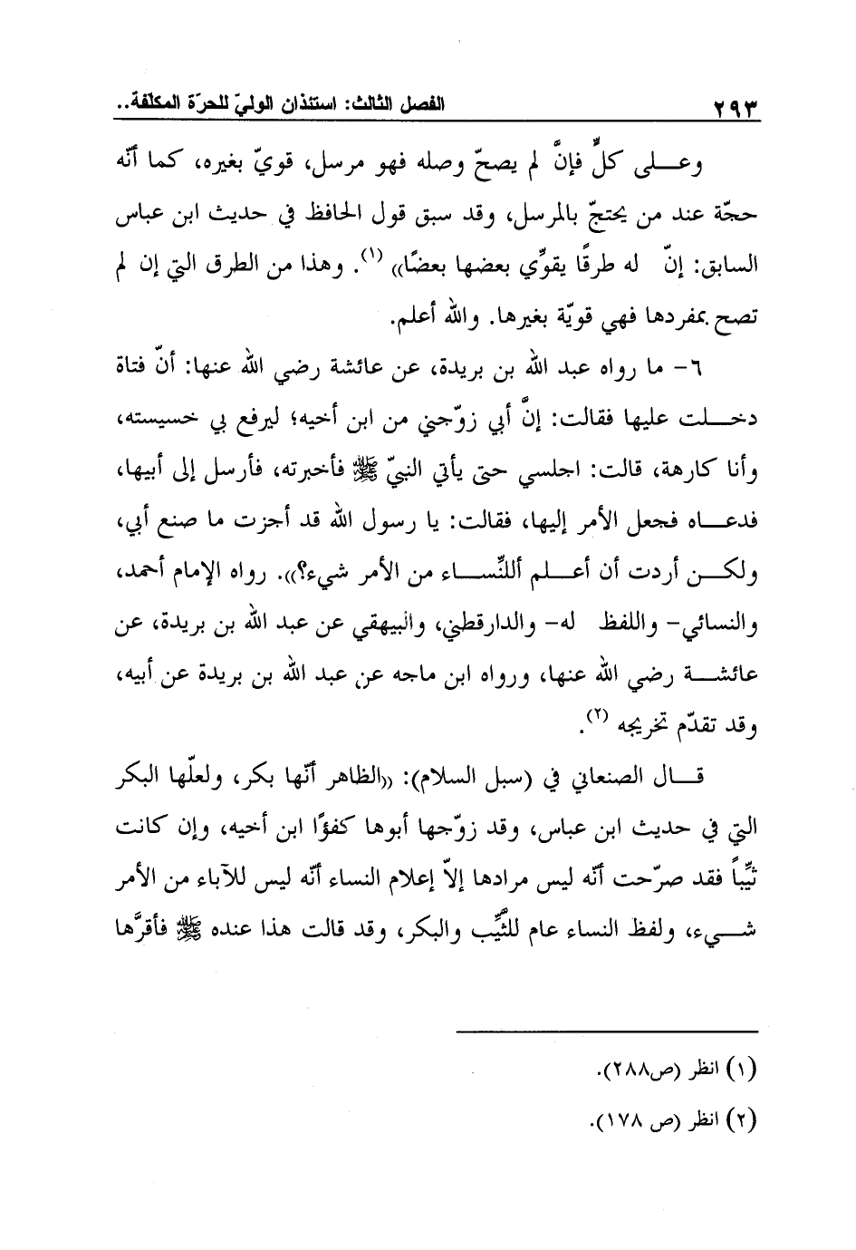 6- ما رواه عبد الله بن بريدة، عن عائشة رضي الله عنها: أنّ فتاة دخلت عليها فقالت: إنَّ أبي زوّجني من ابن أخيه؛ ليرفع بي خسيسته، وأنا كارهة، قالت: اجلسي حتى يأتي النبيّ صلى الله عليه وسلم فأخبرته، فأرسل إلى أبيها، فدعاه فجعل الأمر إليها، فقالت: يا رسول الله قد أجزت ما صنع أبي، ولكن أردت أن أعلم أللنِّساء من الأمر شيء؟ ". رواه الإمام أحمد، والنسائي- واللفظ له- والدارقطني، والبيهقي عن عبد الله بن بريدة، عن عائشة رضي الله عنها، ورواه ابن ماجه عن عبد الله بن بريدة عن أبيه، وقد تقدّم تخريجه2.