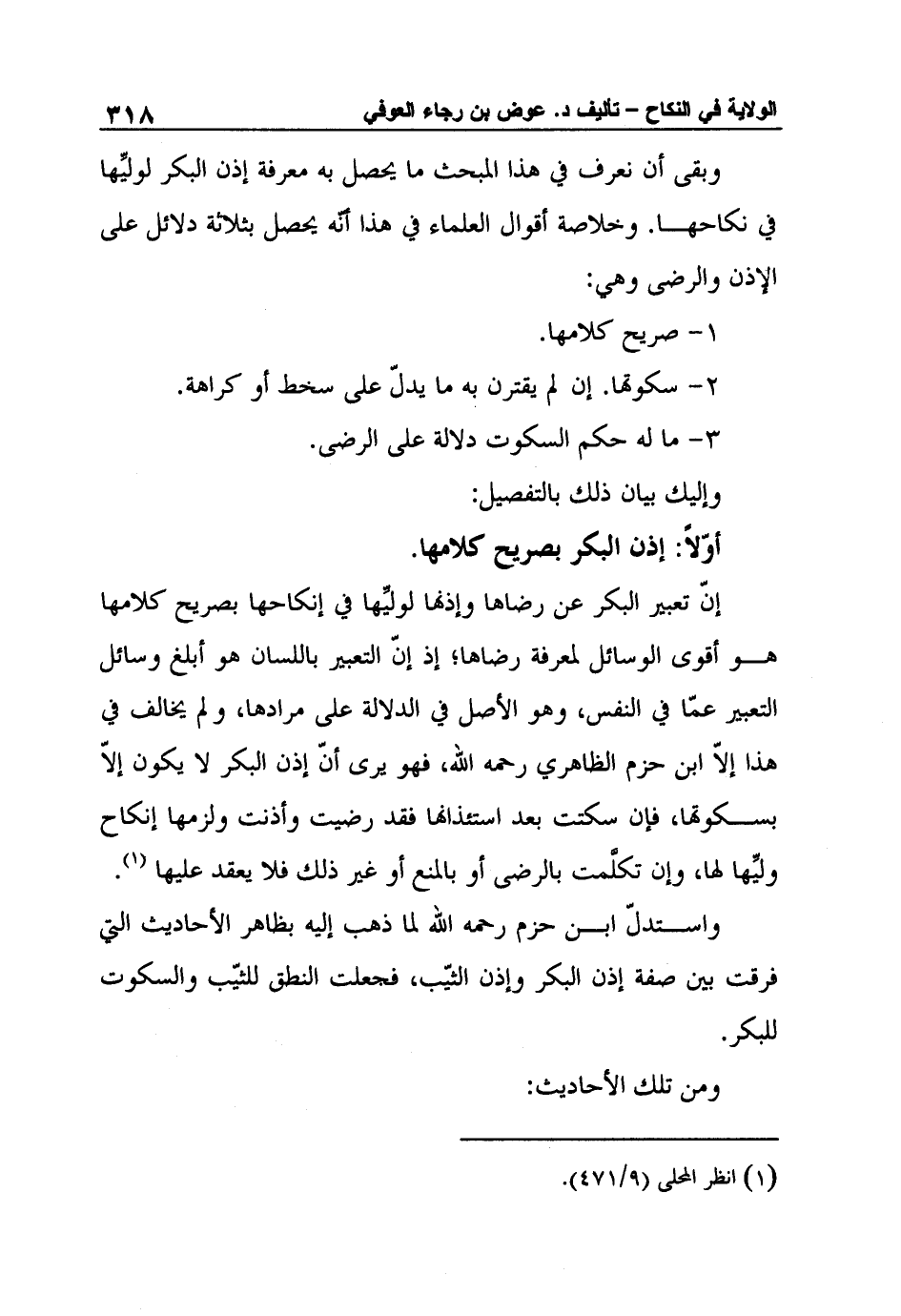 واستدلّ ابن حزم رحمه الله لما ذهب إليه بظاهر الأحاديث التي فرقت بين صفة إذن البكر وإذن الثيّب، فجعلت النطق للثيّب والسكوت للبكر.
