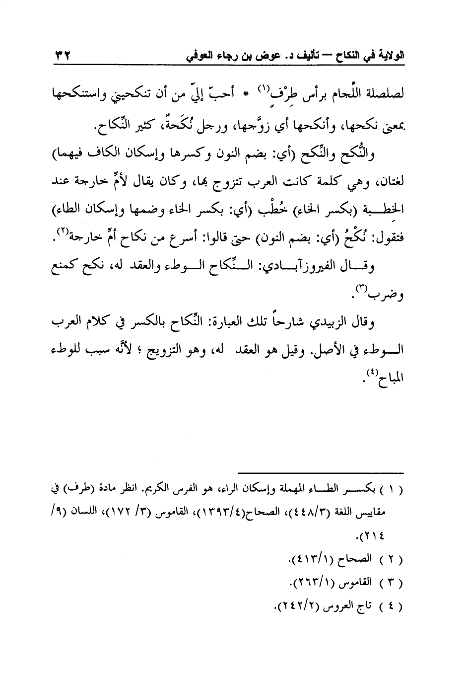وقال الزبيدي شارحاً تلك العبارة: النِّكاح بالكسر في كلام العرب الوطء في الأصل. وقيل هو العقد له، وهو التزويج؛ لأنَّه سبب للوطء المباح4.