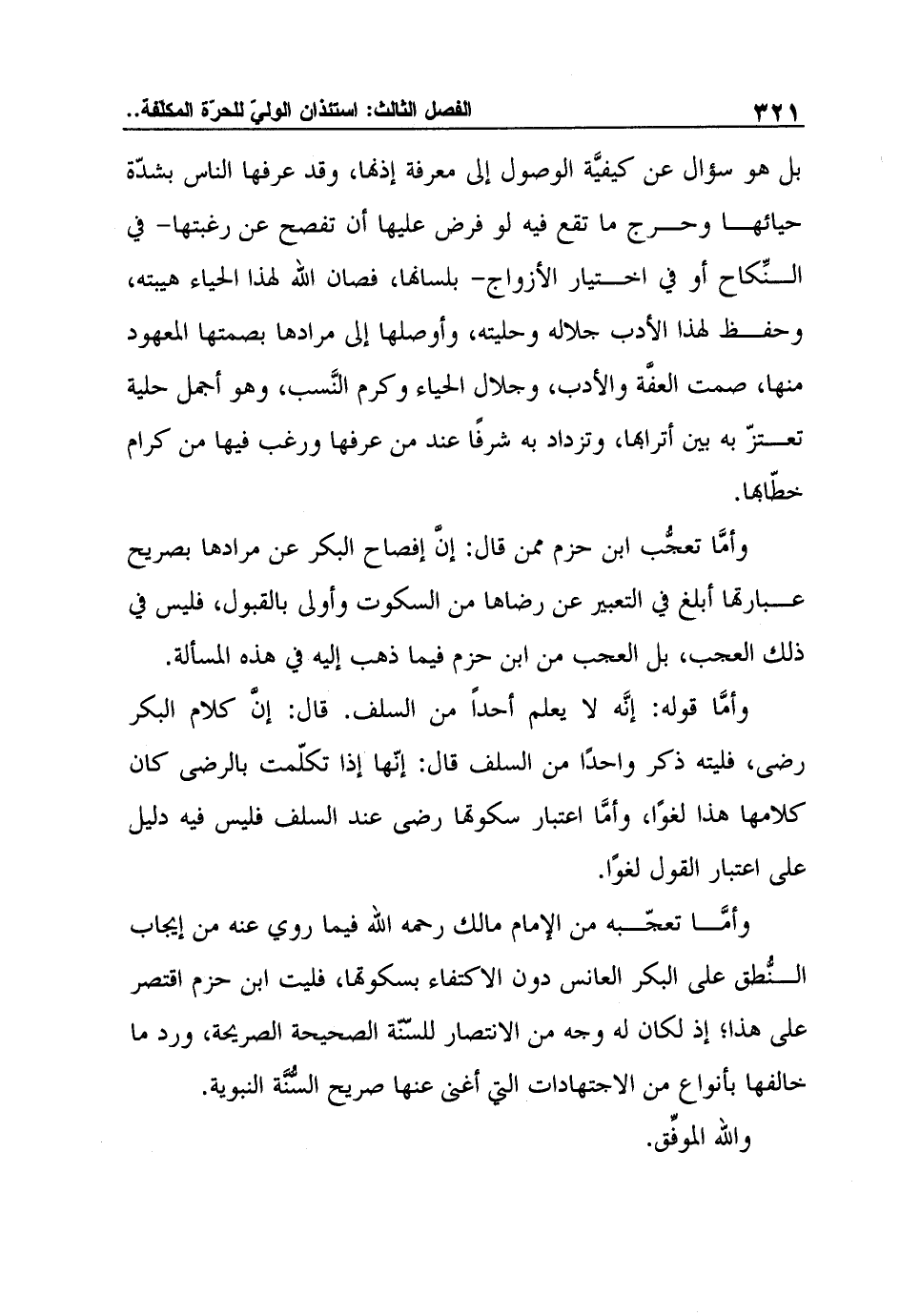 وأمَّا تعجّبه من الإمام مالك رحمه الله فيما روي عنه من إيجاب النُّطق على البكر العانس دون الاكتفاء بسكوتها، فليت ابن حزم اقتصر على هذا؛ إذ لكان له وجه من الانتصار للسّنّة الصحيحة الصريحة، ورد ما خالفها بأنواع من الاجتهادات التي أغنى عنها صريح السُّنَّة النبوية.