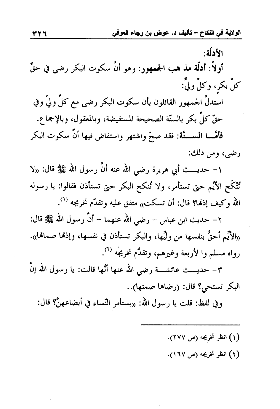 1- حديث أبي هريرة رضي الله عنه أنَّ رسول الله صلى الله عليه وسلم قال: "لا تُتْكَح الأيِّم حتى تستأمر، ولا تُنكح البكر حتى تستأذن فقالوا: يا رسوله الله وكيف إذنها؟ قال: أن تسكت" متفق عليه وتقدّم تخريجه1.