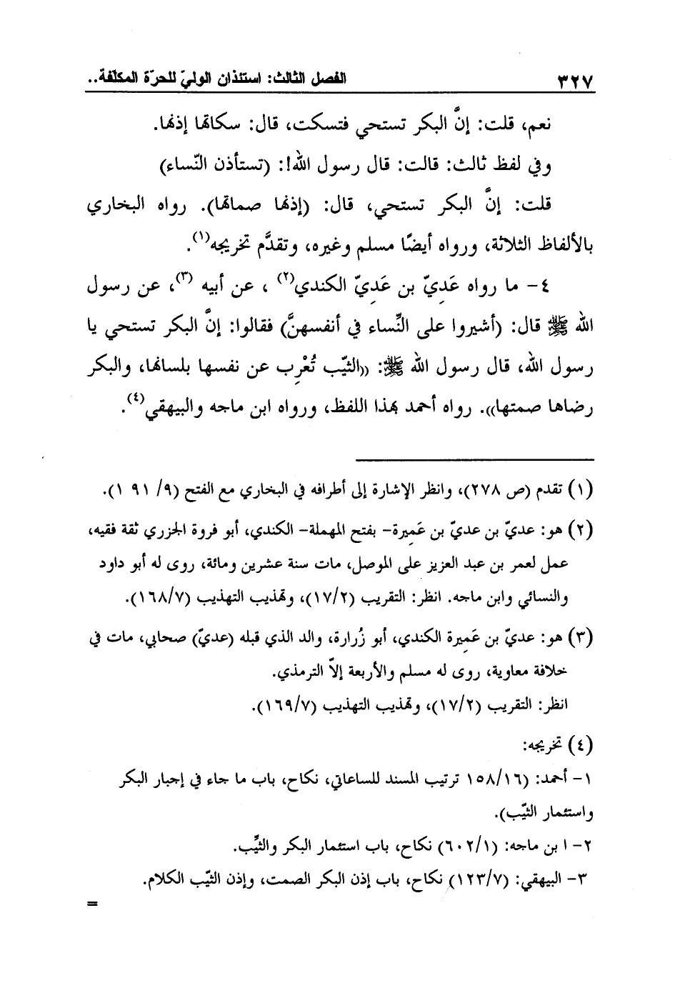 4- ما رواه عَدِيّ بن عَدِيّ الكندي2، عن أبيه 3، عن رسول الله صلى الله عليه وسلم قال: "أشيروا على النِّساء في أنفسهنَّ" فقالوا: إنَّ البكر تستحي يا رسول الله، قال رسول الله صلى الله عليه وسلم: "الثيّب تُعْرِب عن نفسها بلسانها، والبكر رضاها صمتها". رواه أحمد بهذا اللفظ، ورواه ابن ماجه والبيهقي4.