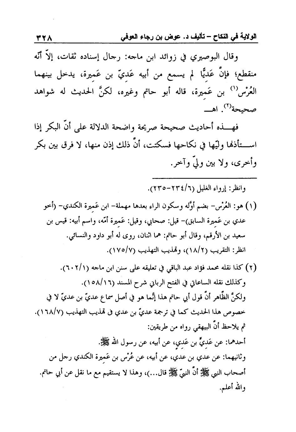 وثانيهما: عن عدي بن عدي، عن أبيه، عن عُرْس بن عَمِيرة الكندي رجل من أصحاب النبي صلى الله عليه وسلم أنَّ النبيّ صلى الله عليه وسلم قال ... ) ، وهذا لا يستقيم مع ما نقل عن أبي حاتم. والله أعلم.