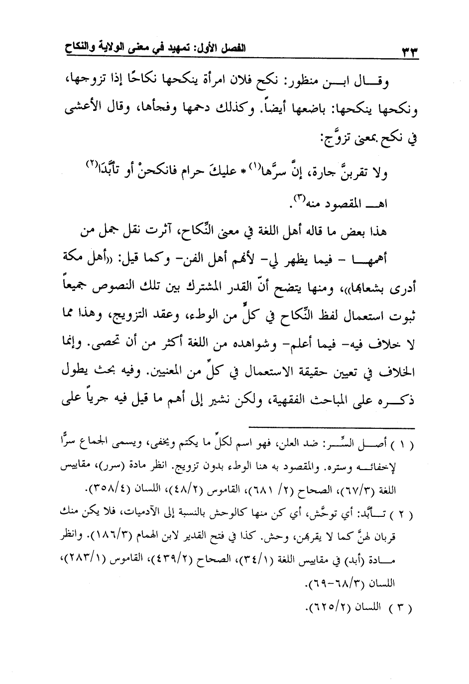 أهمها - فيما يظهر لي- لأنهم أهل الفن- وكما قيل: "أهل مكة أدرى بشعابها"، ومنها يتضح أنّ القدر المشترك بين تلك النصوص جميعاً ثبوت استعمال لفظ النِّكاح في كلٍّ من الوطء، وعقد التزويج، وهذا مما لا خلاف فيه- فيما أعلم- وشواهده من اللغة أكثر من أن تحصى. وإنما الخلاف في تعيين حقيقة الاستعمال في كلِّ من المعنيين. وفيه بحث يطول ذكره على المباحث الفقهية، ولكن نشير إلى أهم ما قيل فيه جرياً على