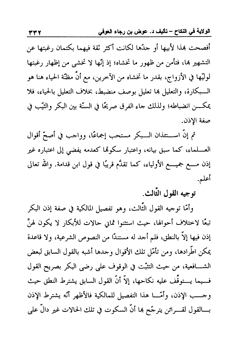 وأمّا توجيه القول الثَّالث، وهو تفصيل المالكية في صفة إذن البكر تبعًا لاختلاف أحوالها، حيث استثنوا ثماني حالات للأبكار لا يكون لهنَّ إذن فيها إلاّ بالنطق، فلم أجد له مستندًا من النصوص الشرعية، ولا قاعدة يمكن اطّرادها، ومن تأمّل تلك الأقوال وجدها أشبه بالقول السابق لبعض الشافعية، من حيث التثبّت في الوقوف على رضى البكر بصريح القول فيما يتوقَّف عليه نكاحها، إلاّ أنّ القول السابق يشترط النطق حيث وجب الإذن، وأمّا هذا التفصيل للمالكية فالأظهر أنّه يشترط الإذن بالقول لقرائن يترجّح بها أنّ السكوت في تلك الحالات غير دالّ على
