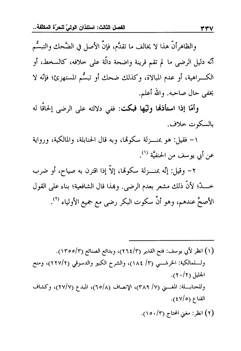 2- وقيل: إنّه بمنزلة سكوتها، إلاّ إذا اقترن به صياح، أو ضرب خدّ؛ لأنّ ذلك مشعر بعدم الرضى. وبهذا قال الشافعية؛ بناء على القول الأصحِّ عندهم، وهو أنَّ سكوت البكر رضى مع جميع الأولياء2.